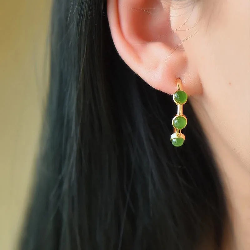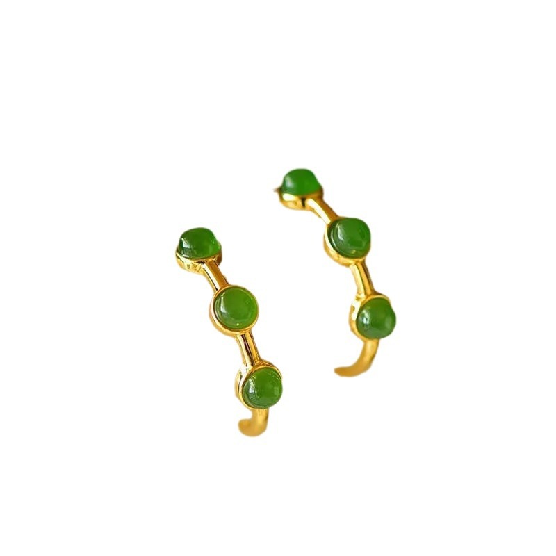 和田碧玉半圆形弯月耳环银S925镀金镶嵌耳钉简约气质民族风耳饰