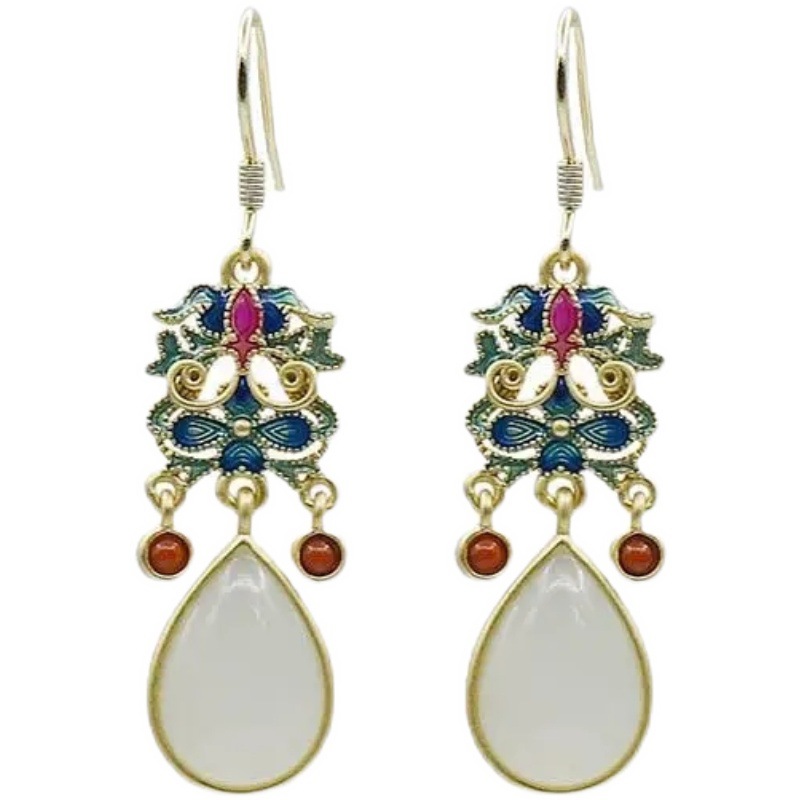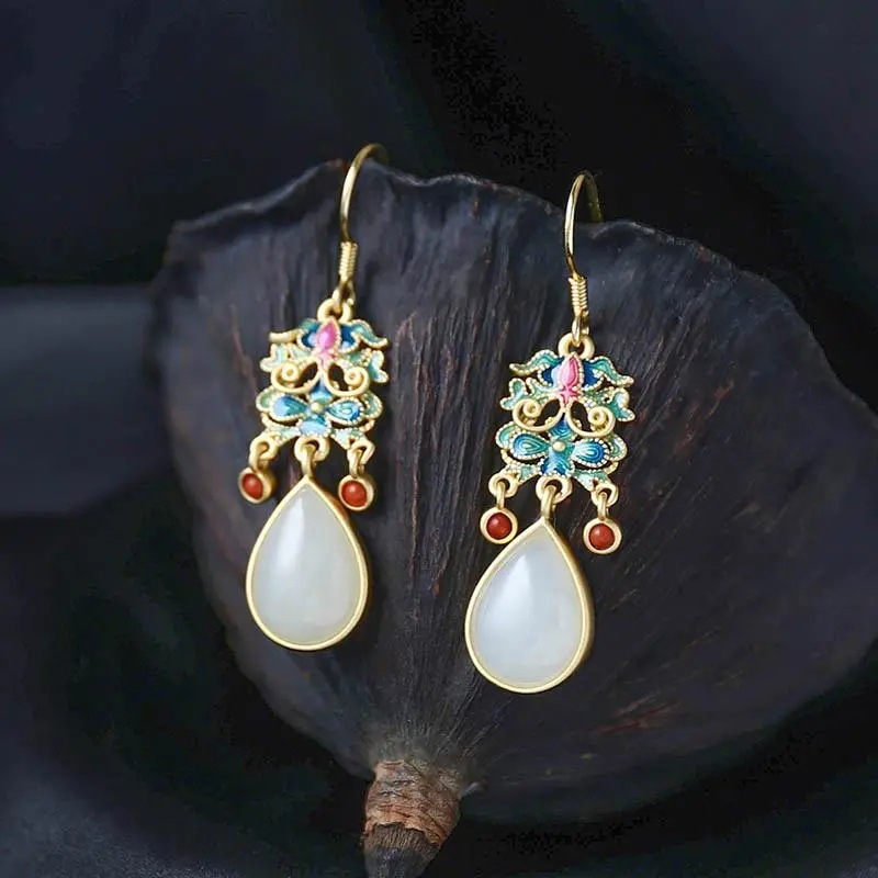 汉服宫廷中式耳坠中国复古风和田耳环宋代阳绿耳钉旗袍流苏耳饰
