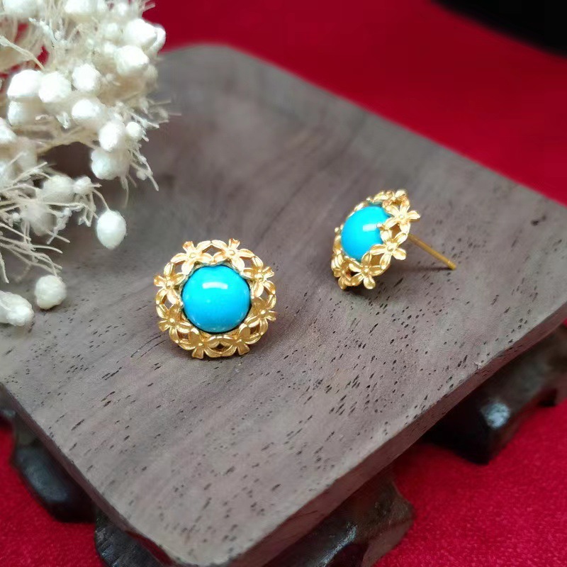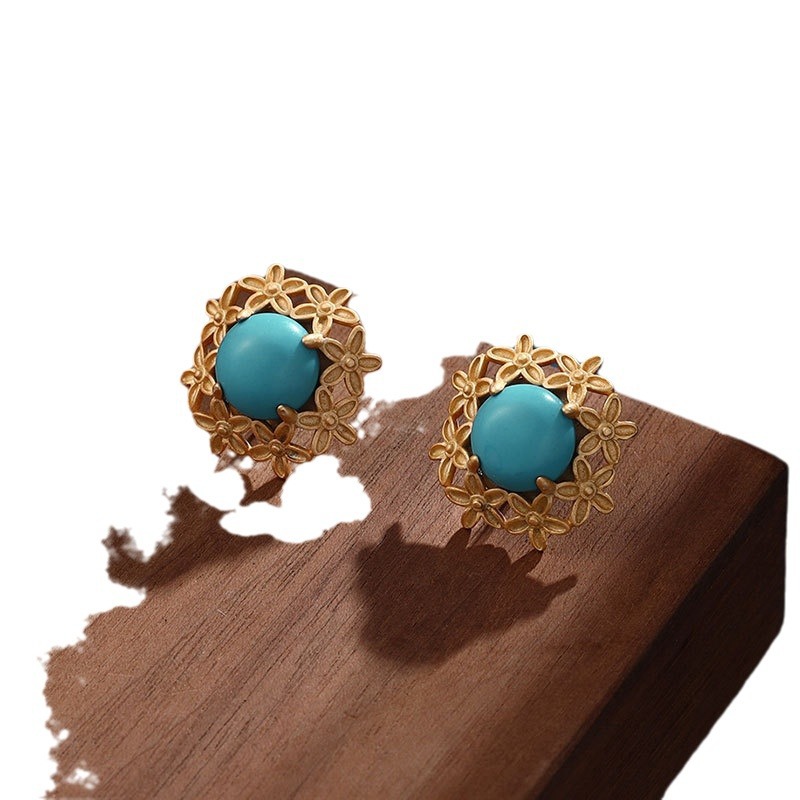 复古花朵耳饰古法金镶绿松石耳钉女小花瓣百搭古装汉服耳环