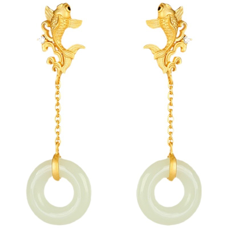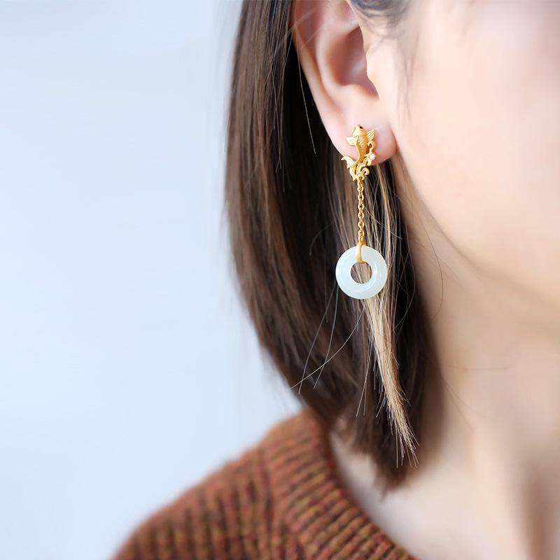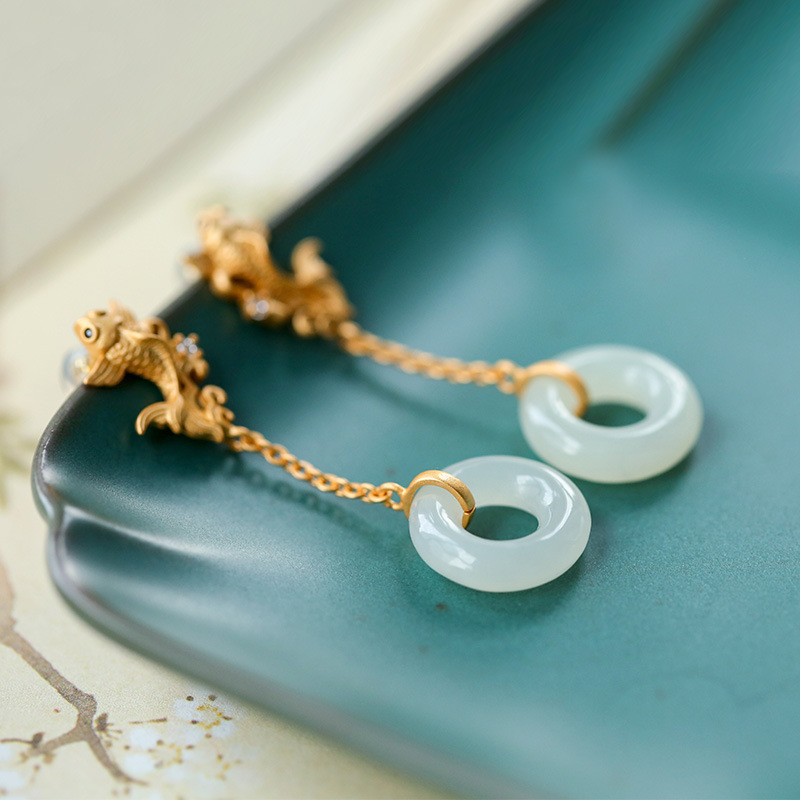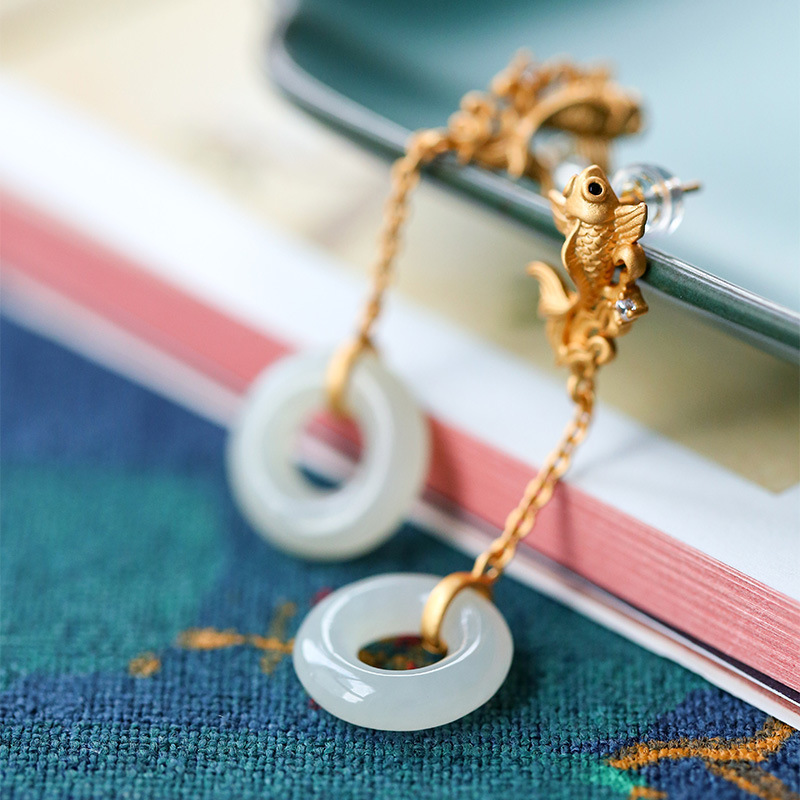 和田白玉甜甜圈耳坠S925纯银鲤鱼流苏耳环小众设计感独特