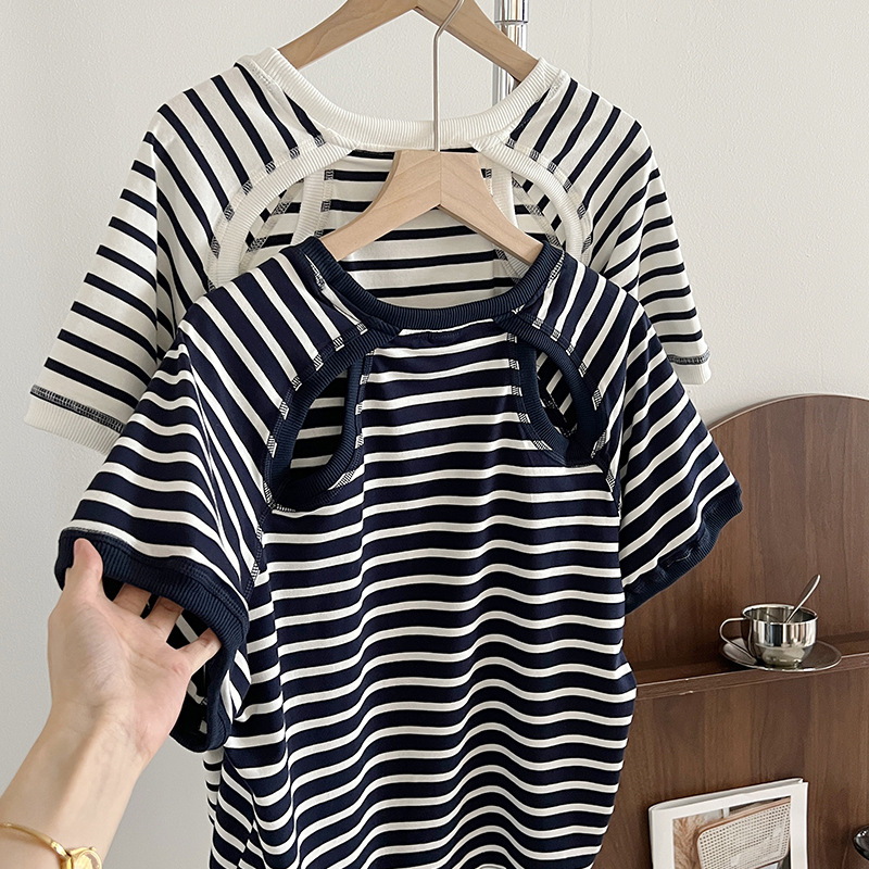镂空露背设计感小众正肩圆领短袖T恤女韩版新款夏季宽松条纹上衣