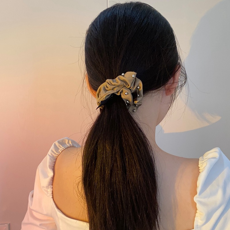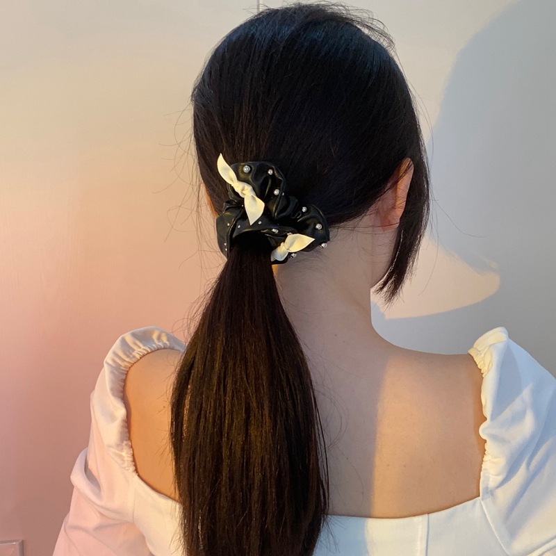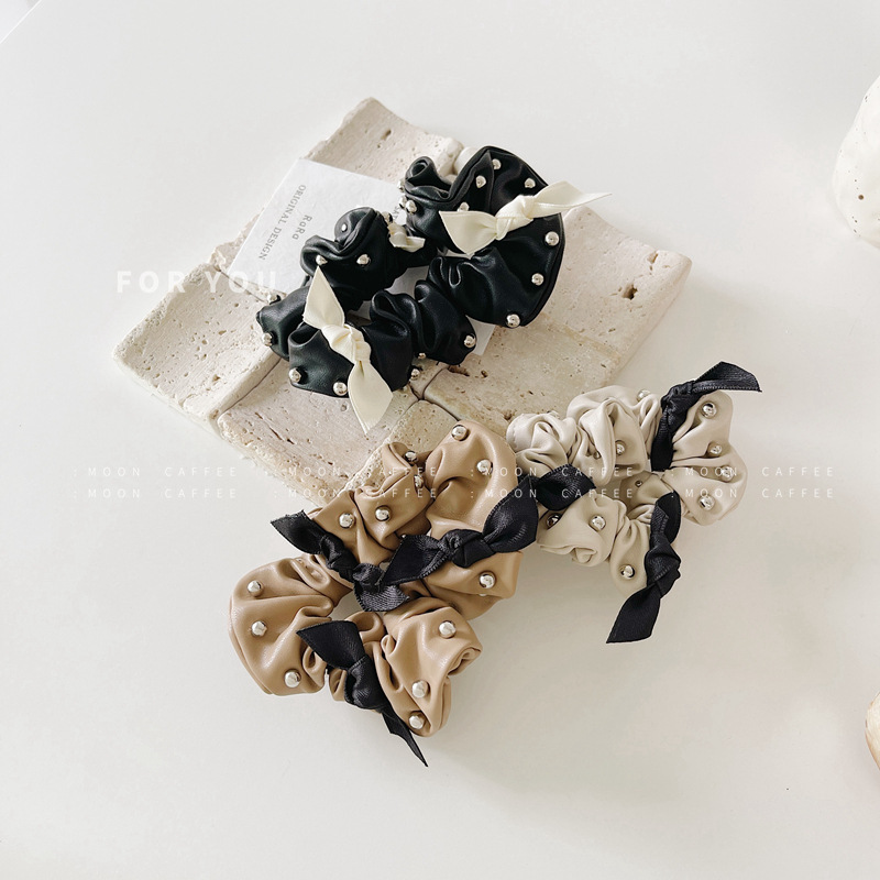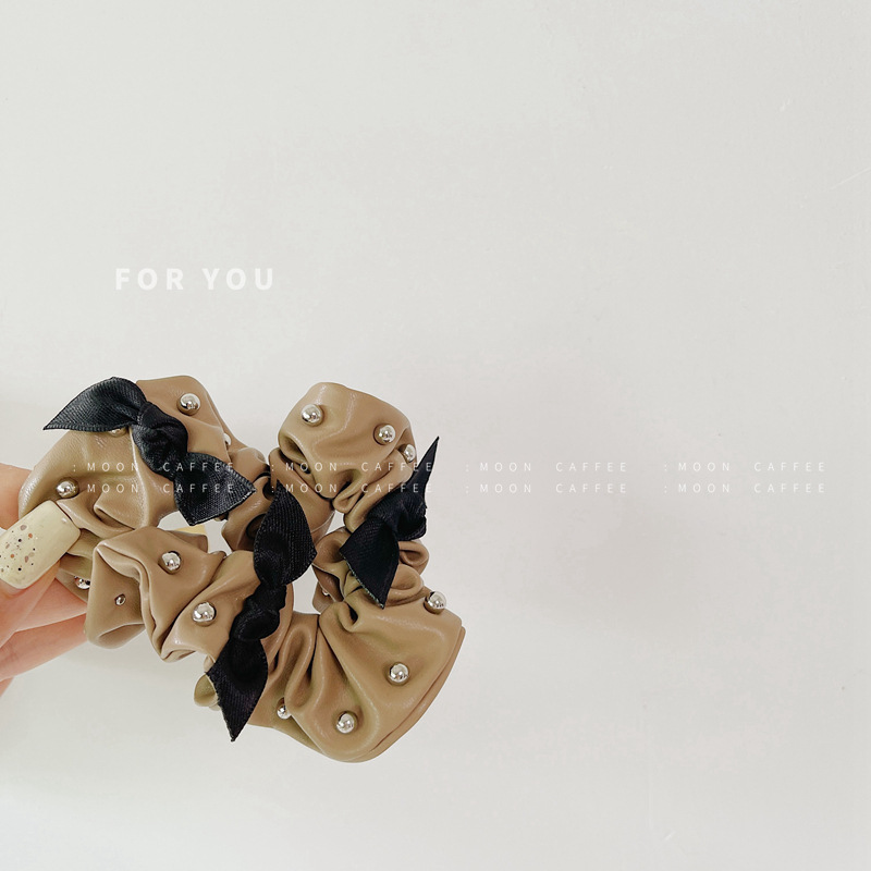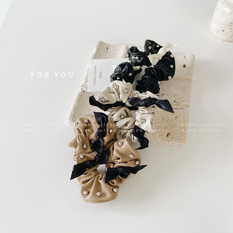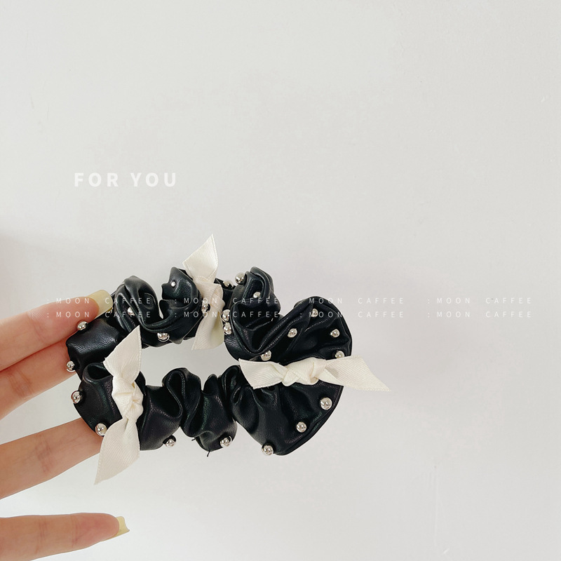 韩国东大门新款PU皮质钉珠蝴蝶结大肠发圈气质复合发绳头饰潮