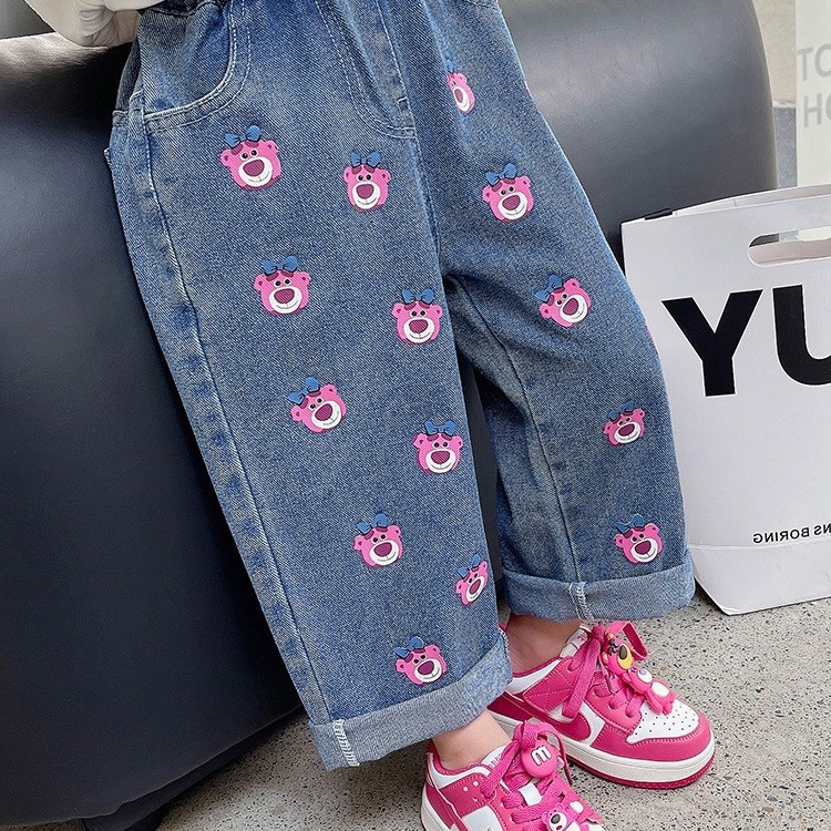 春秋女童装牛仔裤宝宝洋气儿童个性潮牌韩版卡通草莓熊网红阔腿裤