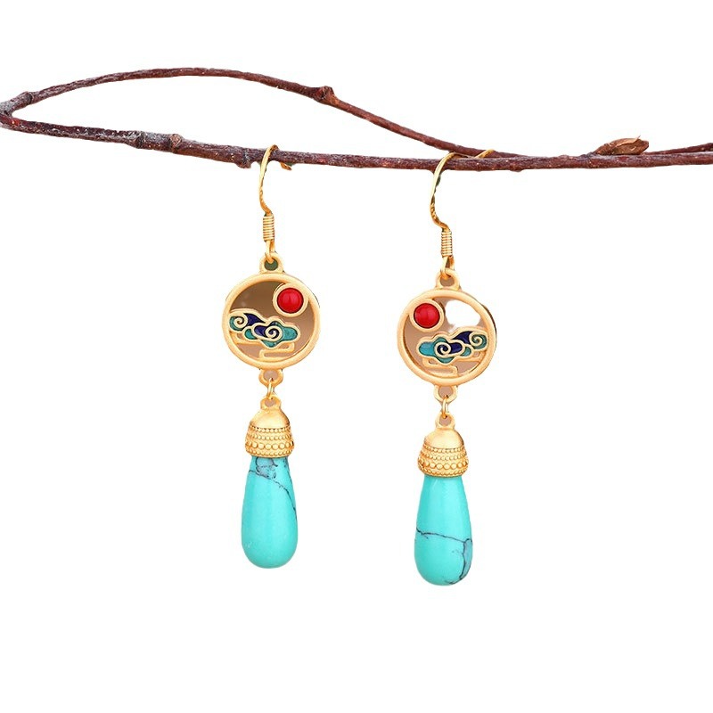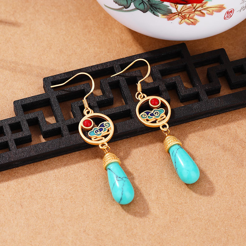 网红直播供货中国风旗袍古装耳饰古法镀金珐琅彩祥云绿松石耳环女