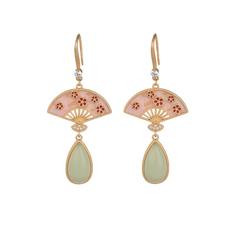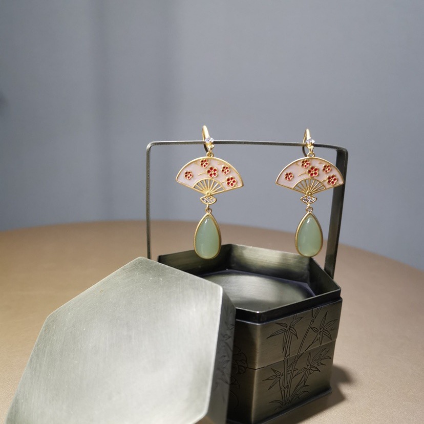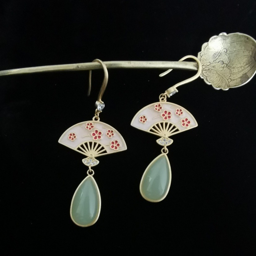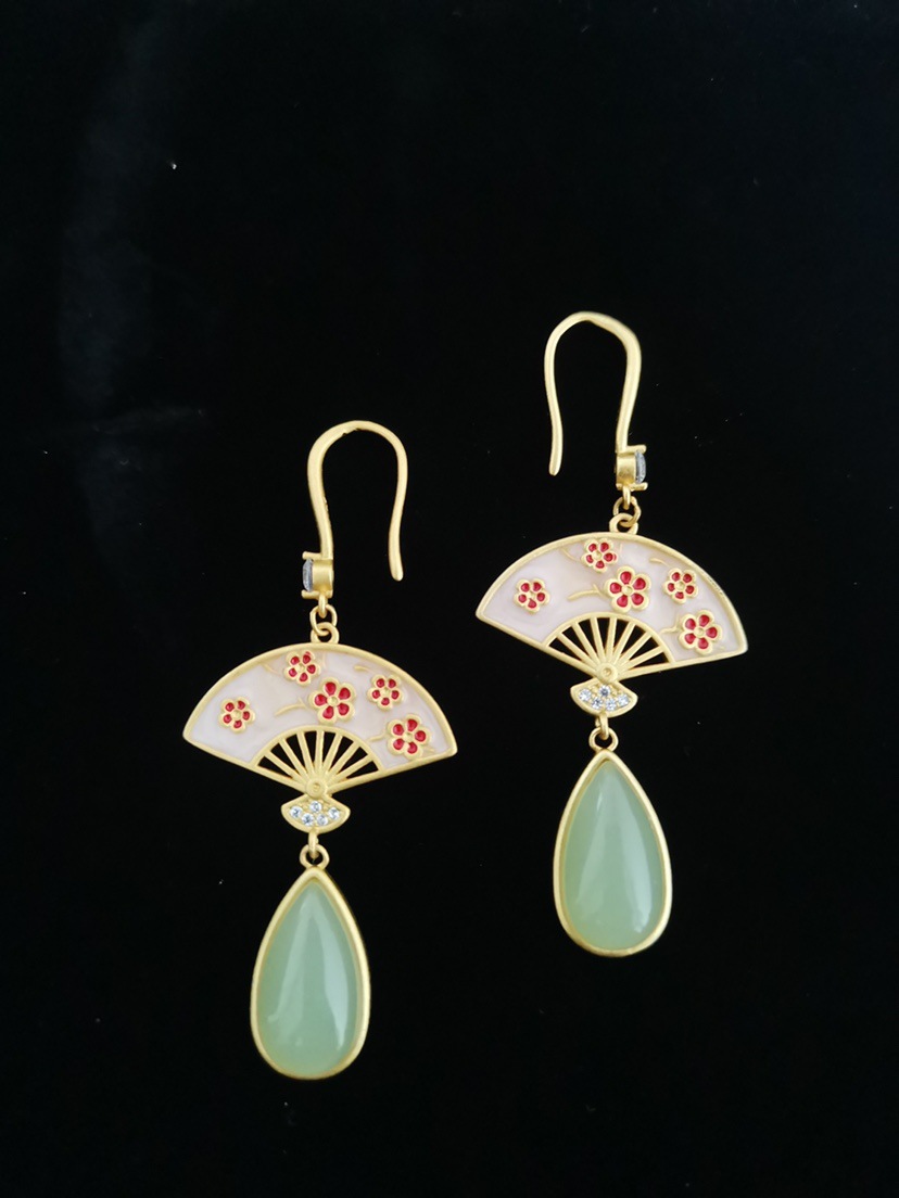 国风古法镀金珐琅彩宫廷团扇和田耳环女