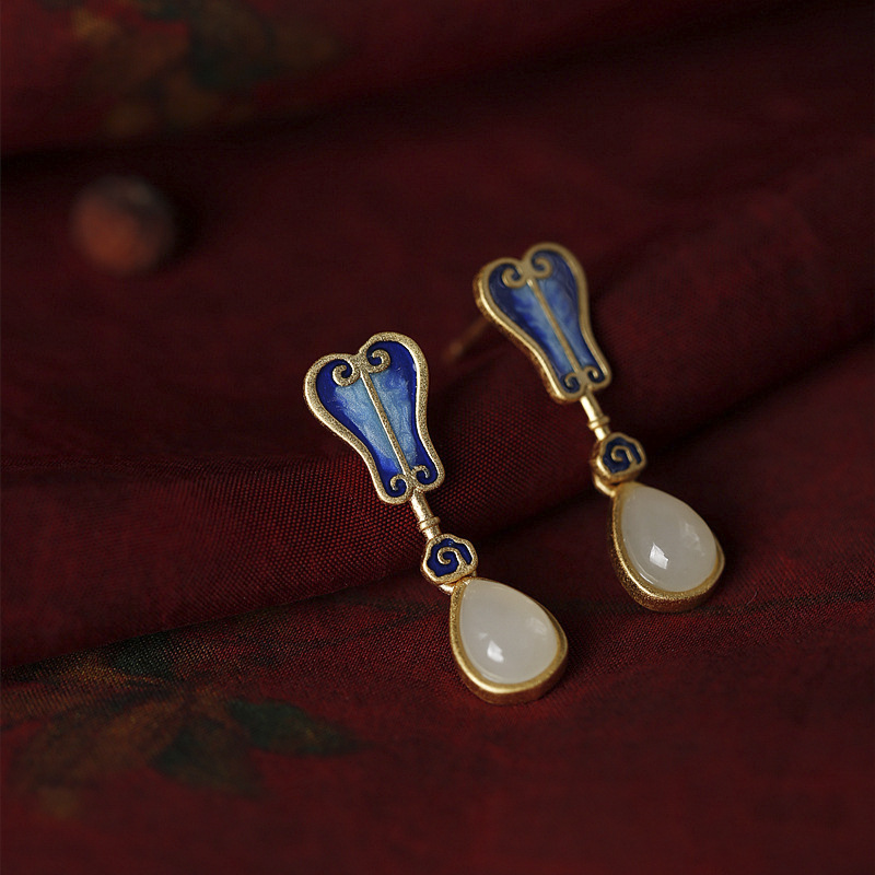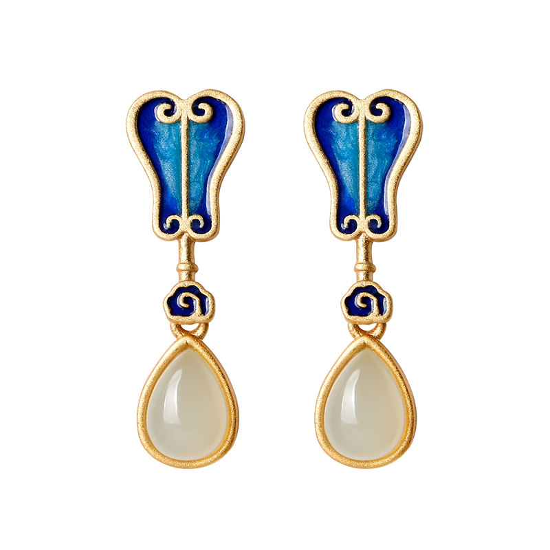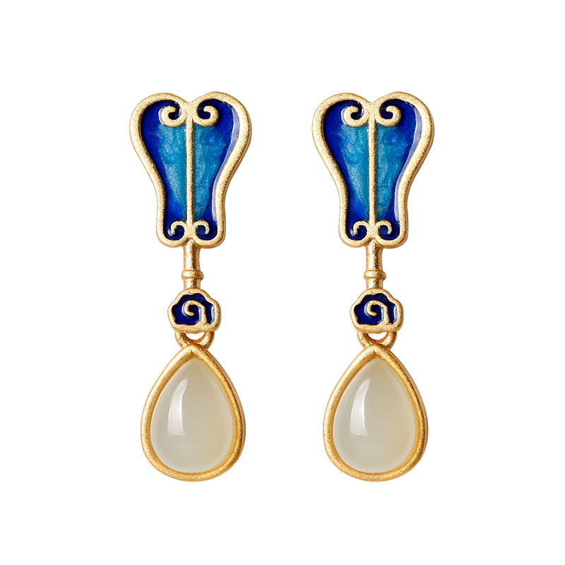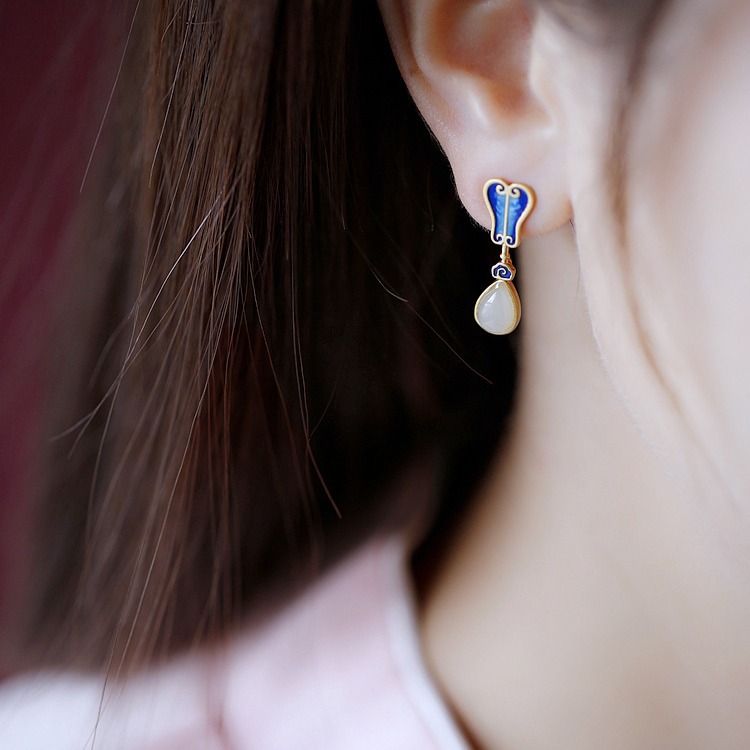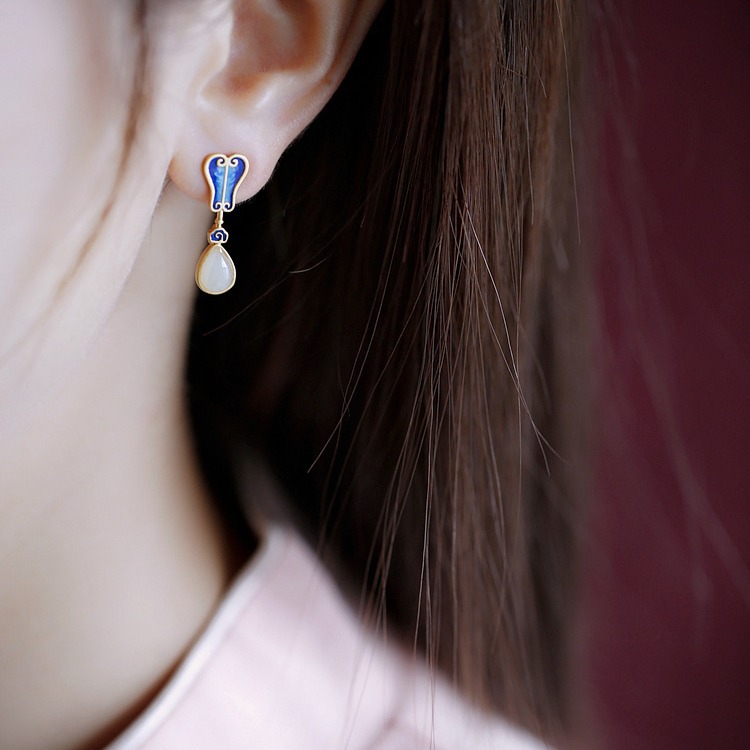 纯银古法金镶和田彩釉中国风复古耳环女耳钉耳坠耳饰