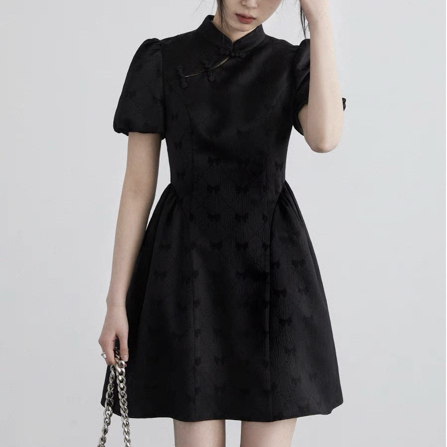 「浪漫出游」春季新中式仿醋酸蝴蝶结泡泡短袖旗袍连衣裙