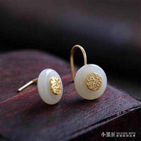 S925纯银和田福字耳环高级感耳钉潮个性简约鎏金工艺银饰耳饰