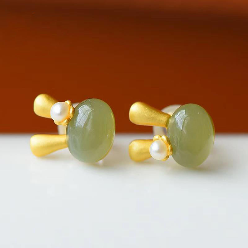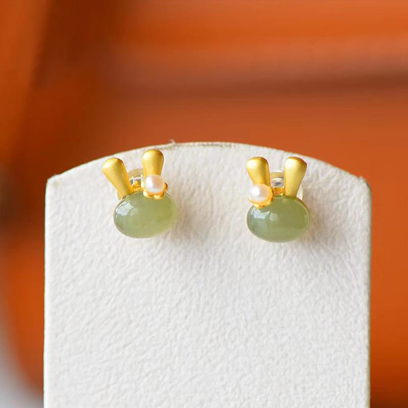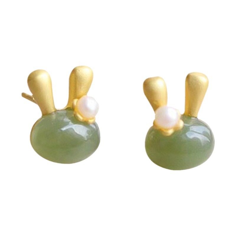 满满少女心超可耐青玉小兔子耳钉古法纯银鎏金精致甜美趣味耳饰女
