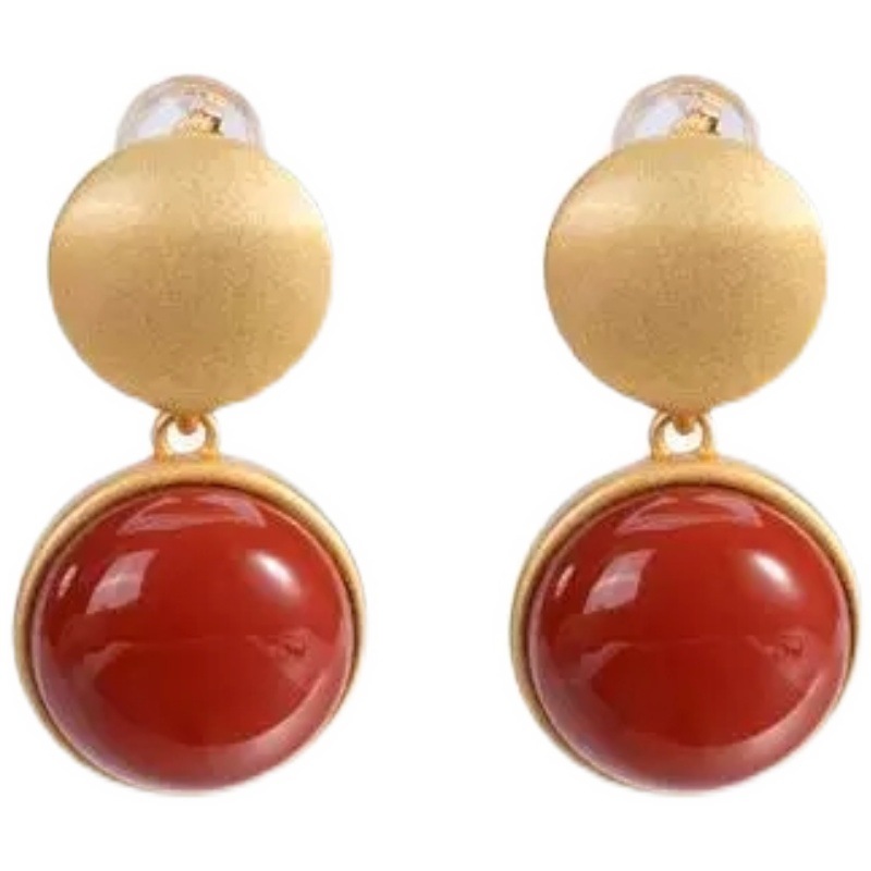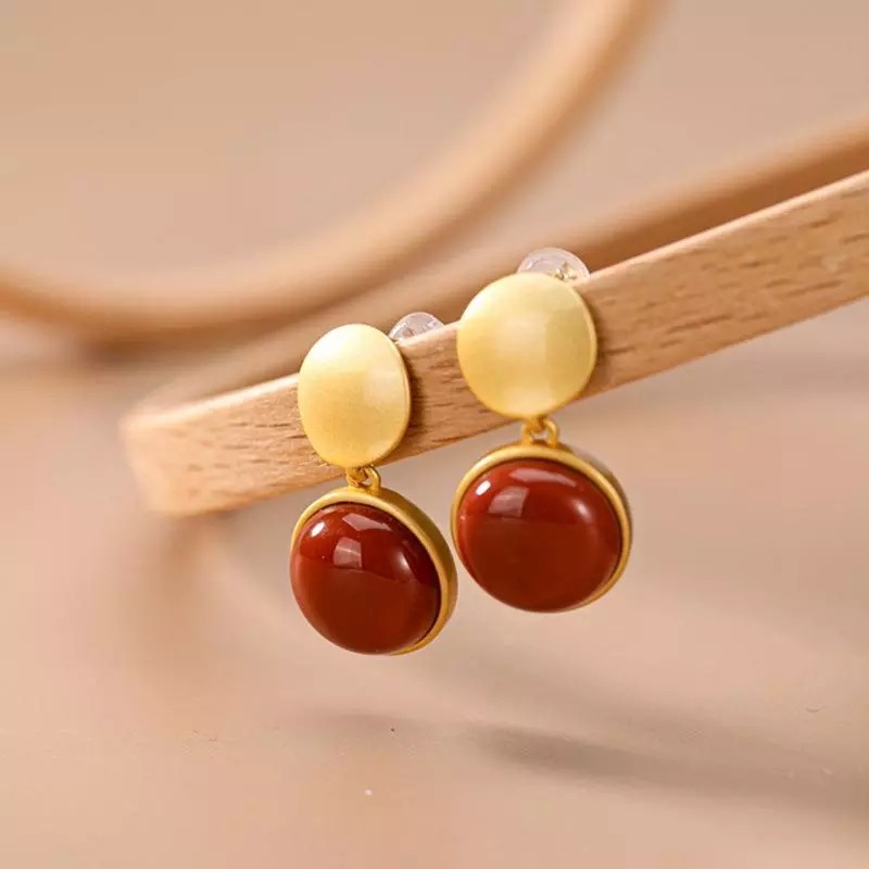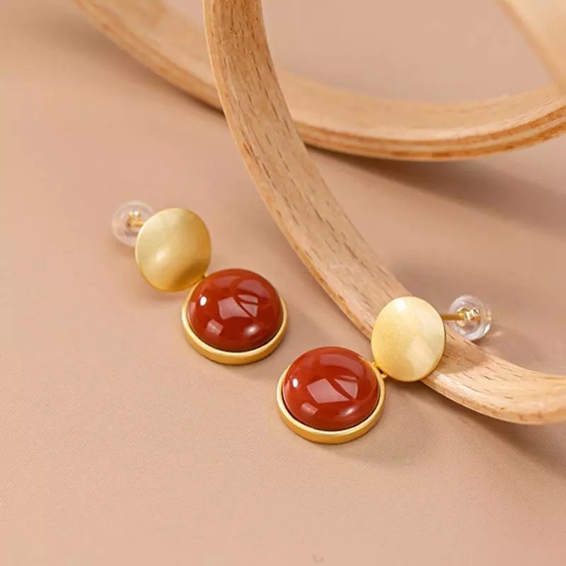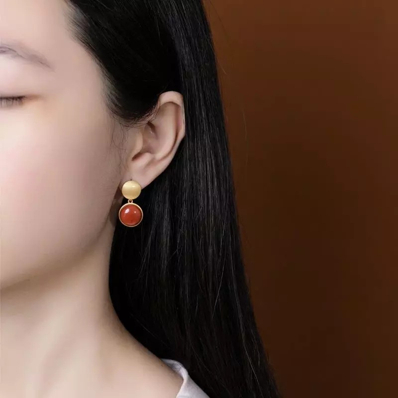 S925银镀18K金南红复古百搭不过敏简约百搭女士耳钉耳坠