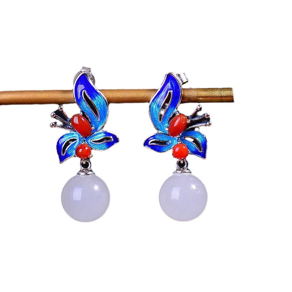 2025古法金S925纯银蝴蝶耳钉镶嵌天然和田白玉复古珠珐琅圆珠耳坠