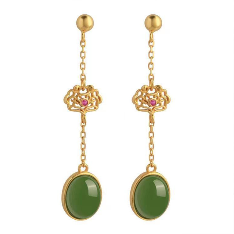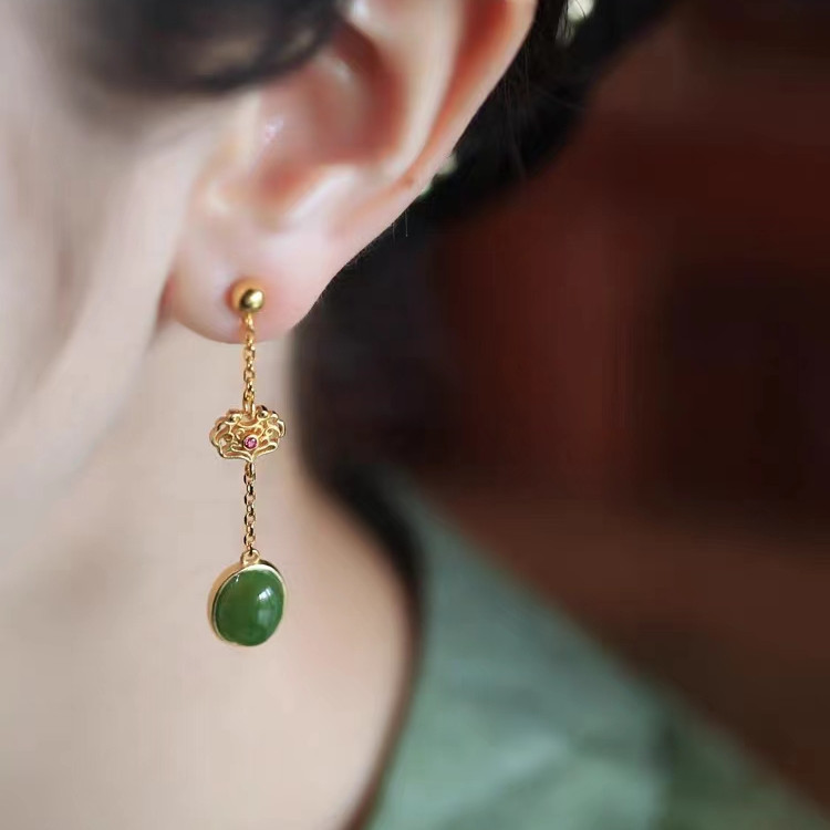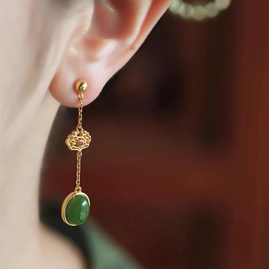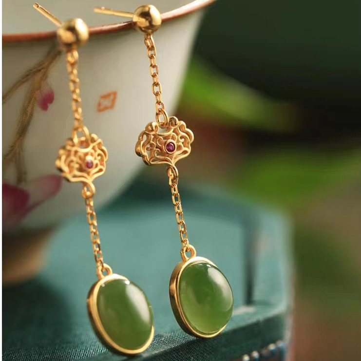925银古法金中国风如意蛋面和田玉碧玉长耳钉女玉石耳饰耳坠母亲