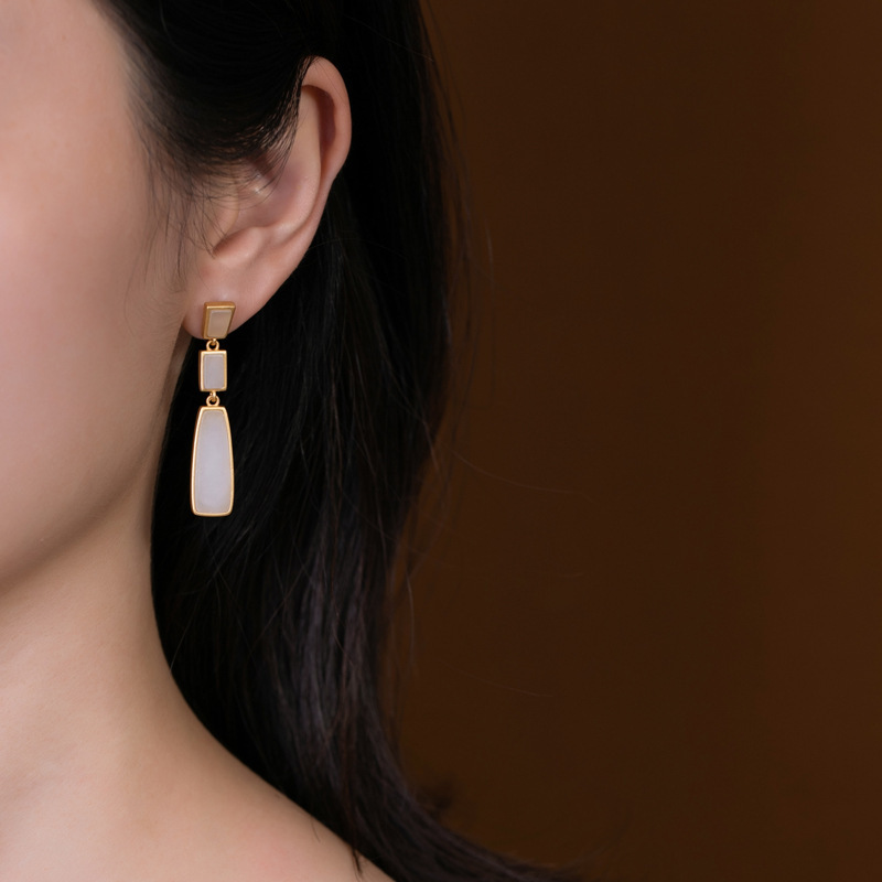 S925纯银镀金天然和田玉耳钉个性气质几何女士长款耳坠耳环