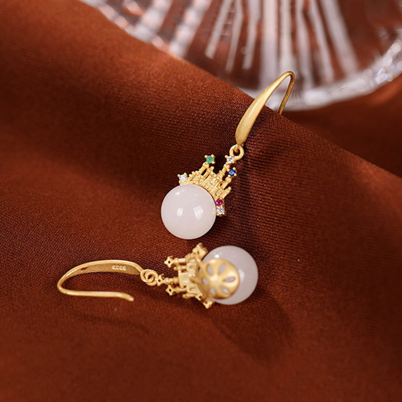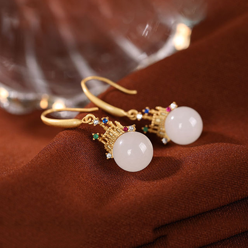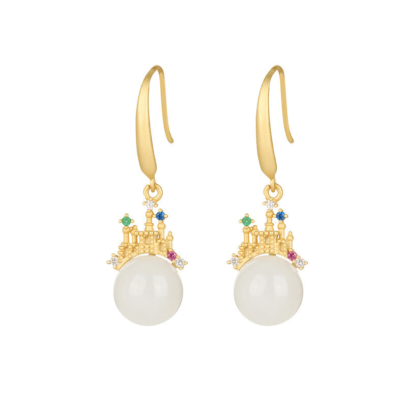 几何镀金镶嵌锆石城堡耳环轻奢时尚和田白玉宫廷风耳坠耳饰女士