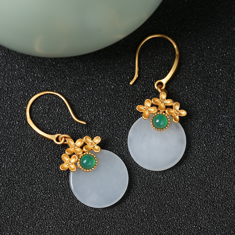 和田玉古法金镶玉圆形S925纯银耳坠白玉耳环气质高级感耳饰品女友