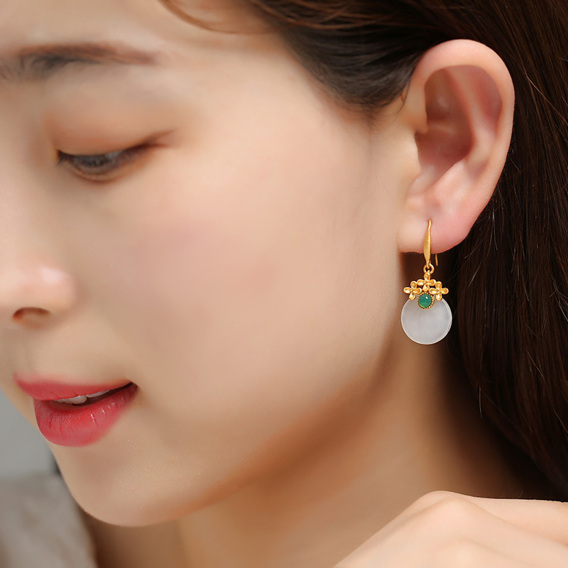 古法鎏金故宫S925纯银玉圆珠耳坠女款时尚个性女竹叶白玉古典耳饰