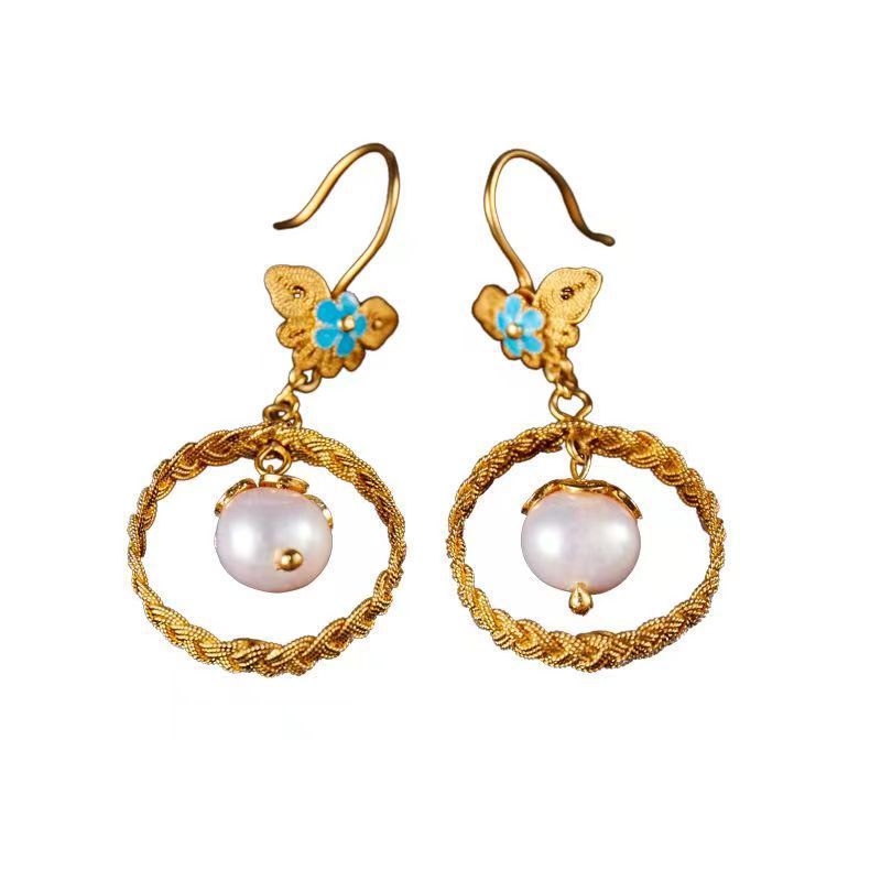 新款花丝镶嵌烧蓝珍珠掐丝耳环镀金复古累丝耳饰搭配古装汉服