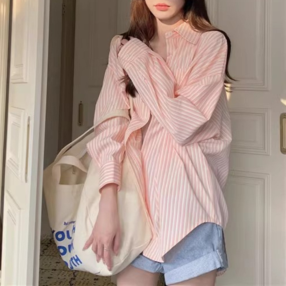 粉色条纹防晒衬衫女薄款夏季外搭宽松慵懒风长袖衬衣开衫外套上衣