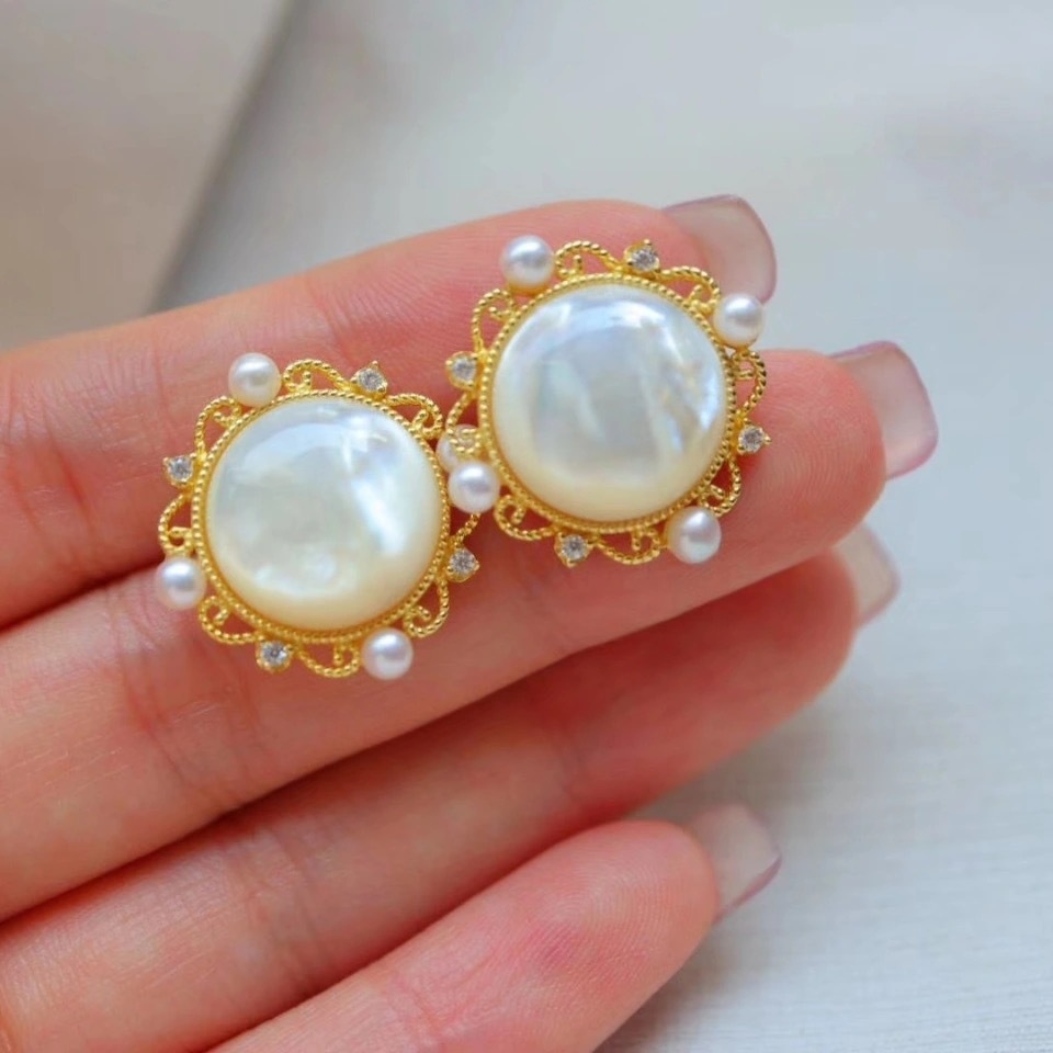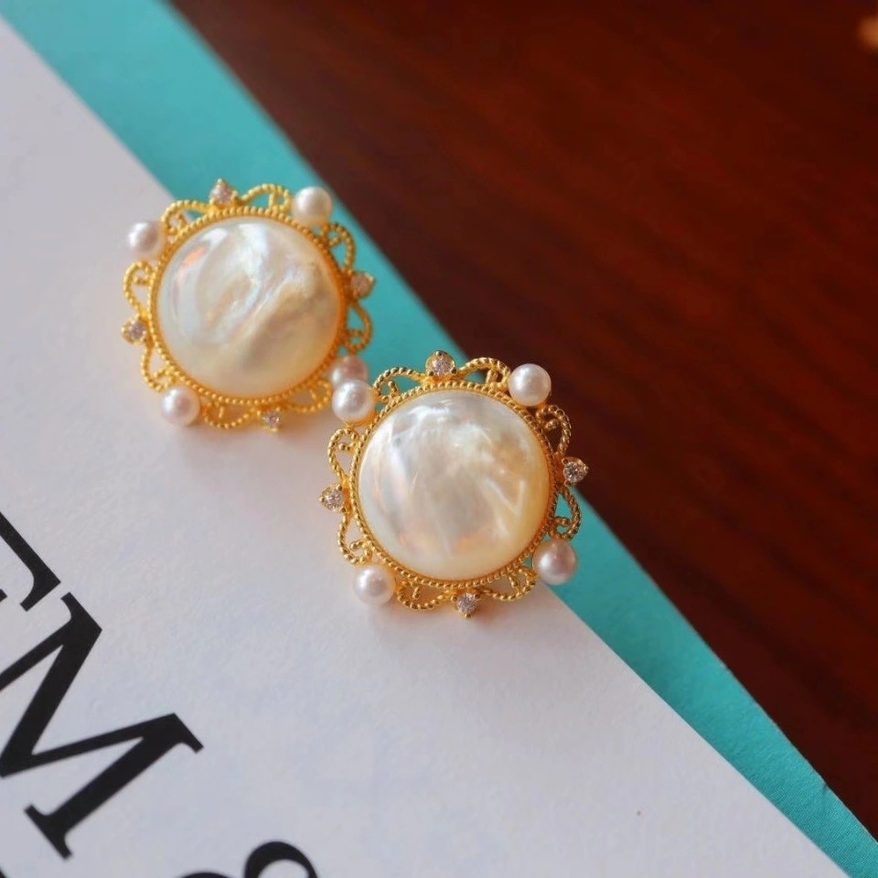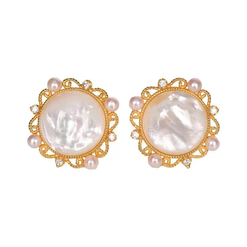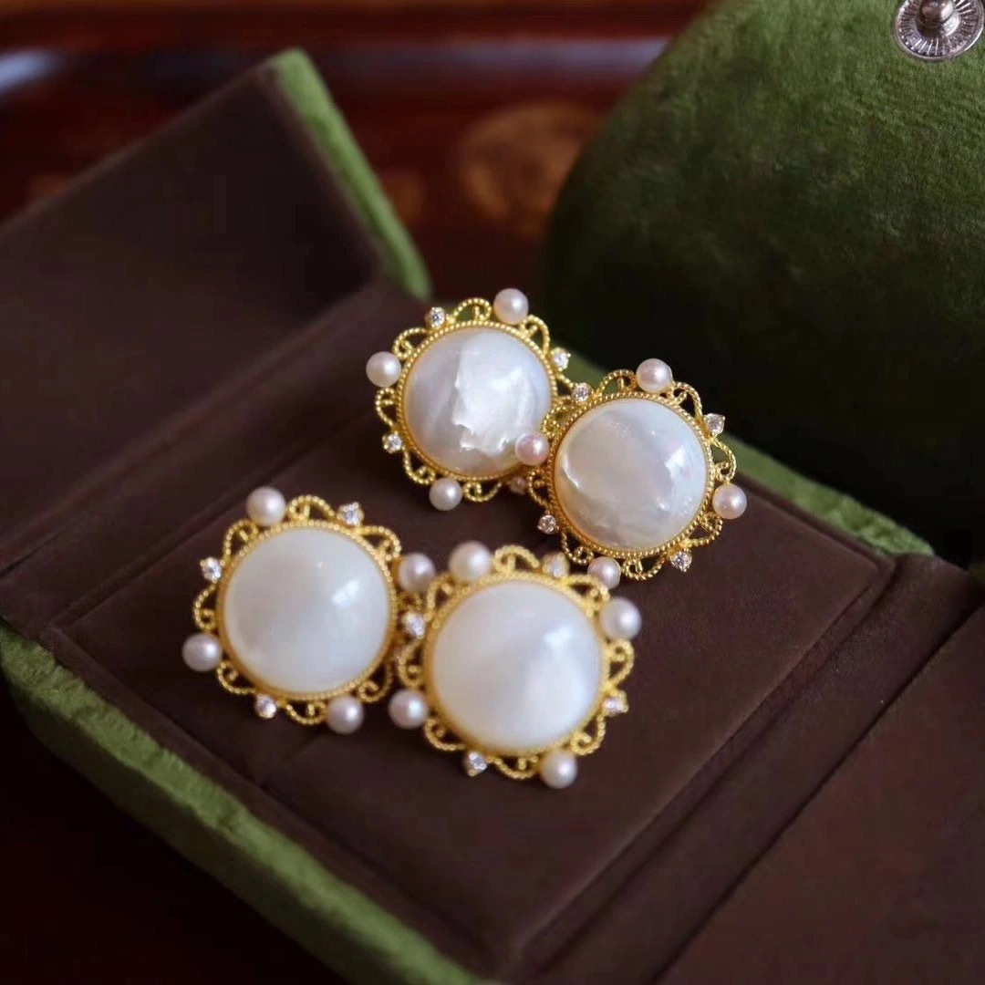 复古镶嵌珍珠耳钉简约几何镀金锆石个性气质宫廷设计耳钉百搭女士