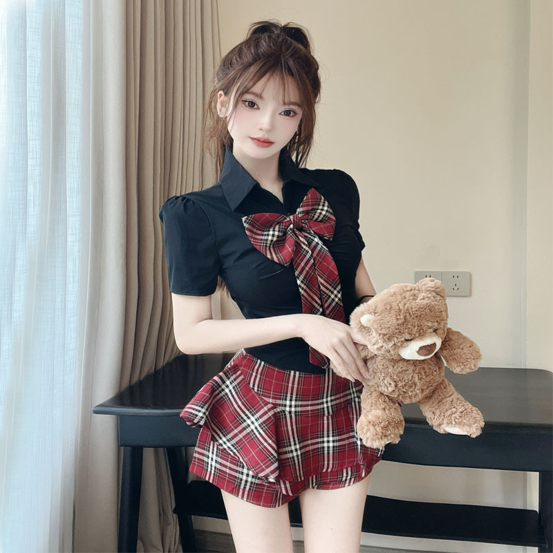 学院风辣妹jk制服套装夏季短袖蝴蝶结修身衬衫+高腰格子裙两件套