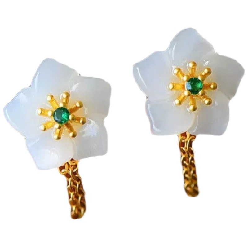 新款仙气森系超仙精致女款白玉梅花花朵款S925纯银流苏耳钉饰品