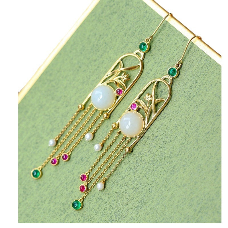 镀金色耳钩嵌仿和田白兰花中式长款流苏耳环耳坠复古耳饰品礼物