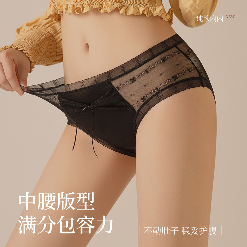 中国风朦胧美性感俏皮网纱拼接绸缎蕾丝女士内裤中低腰包臀三角裤