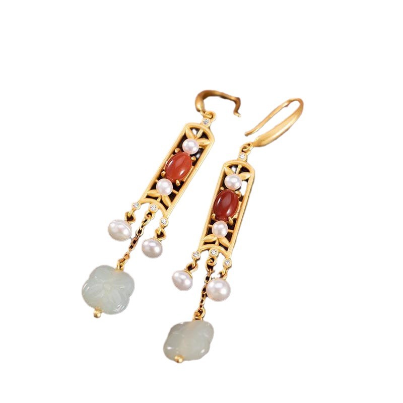 南红古风宫廷大气长款气质女款耳坠纯银针镀金耳环民族风耳饰礼物