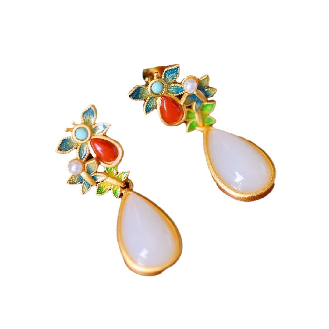 轻奢天然和田玉耳环女纯银南红耳钉国潮彩绘珐琅耳饰新年礼物