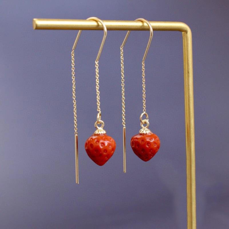 小草莓18K金镶天然南红耳环高级感个性长款耳坠钩气质女耳饰耳钉