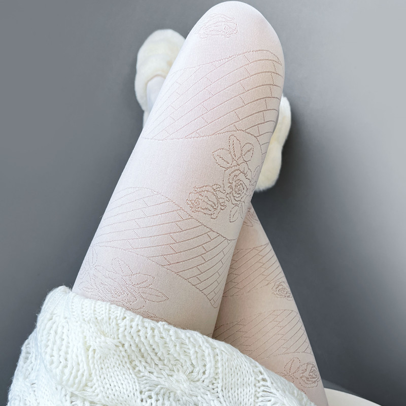 原创纯欲风玫瑰花朵斜条纹格子双拼奶白色丝袜唯美显瘦连裤袜女