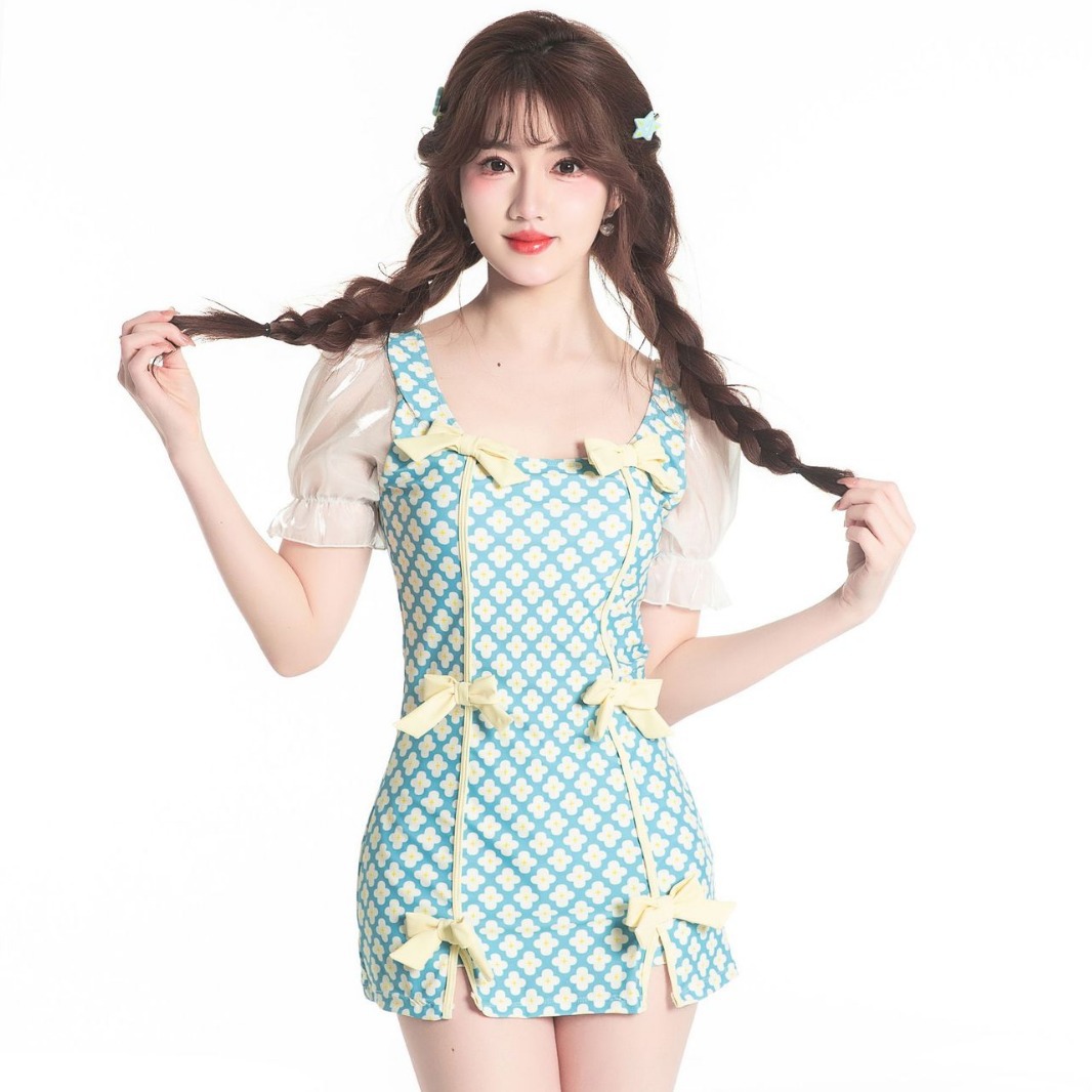 甜美可爱仙女纯欲风泳衣小香风薄纱泡泡袖蝴蝶结修身连体裙式泳衣