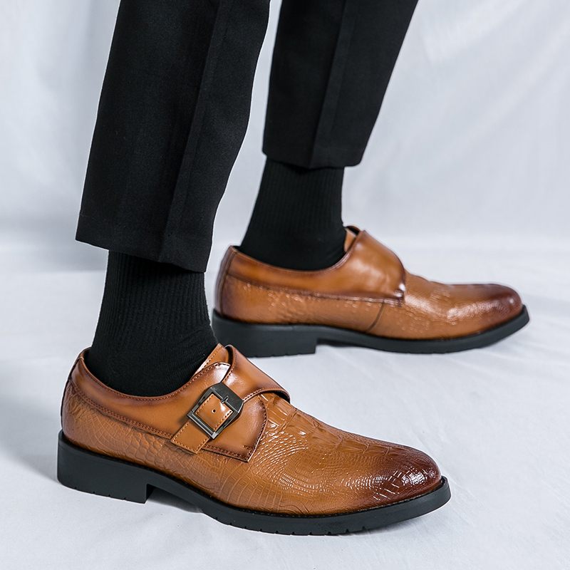 皮鞋男秋季新款商务休闲尖头皮鞋简约搭扣软底舒适孟克鞋