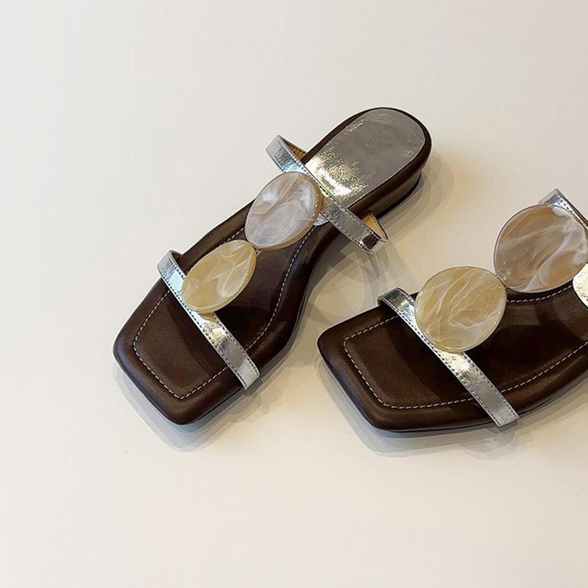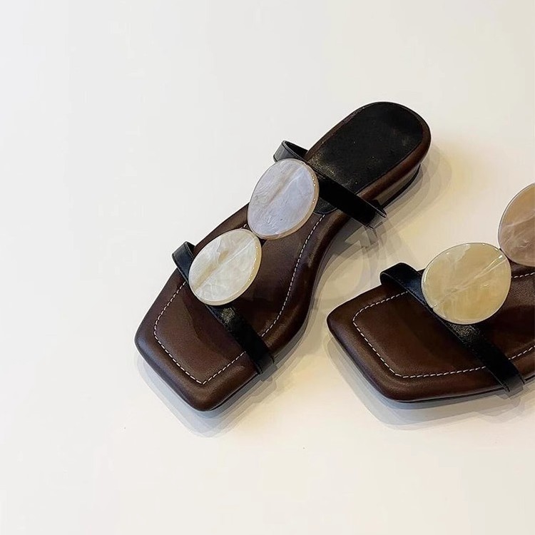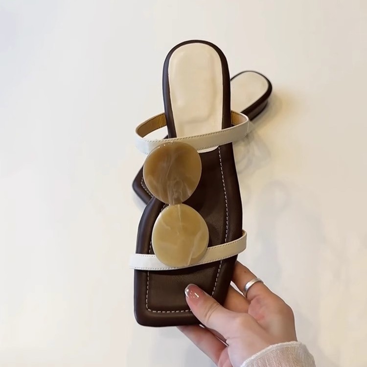 羊皮版~新款一字带方头外穿露趾凉拖鞋女复古波西米亚风平底拖鞋