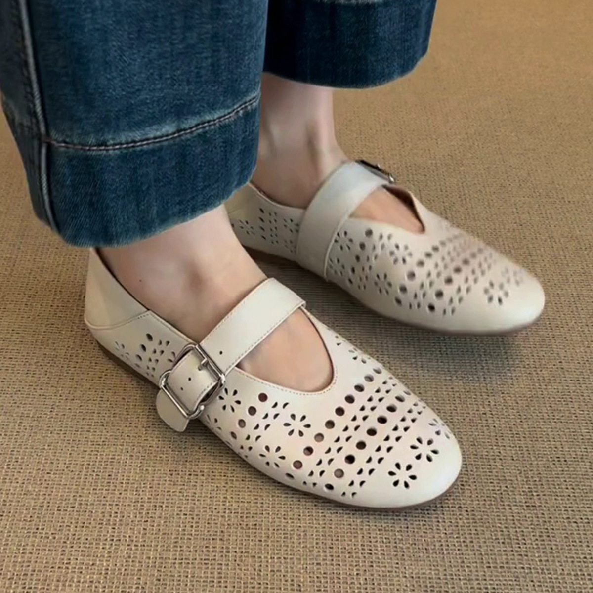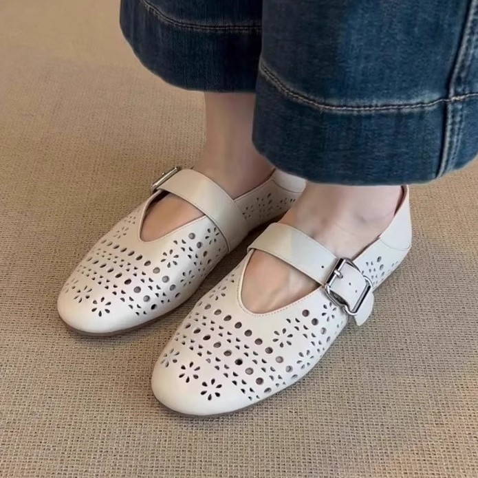 真皮镂空法式浅口单鞋女2025新款夏季一字带超软平底洞洞玛丽珍鞋