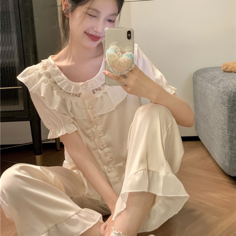 法式宫廷风蕾丝荷叶边圆领冰丝短袖长裤睡衣甜美宽松家居服套装女