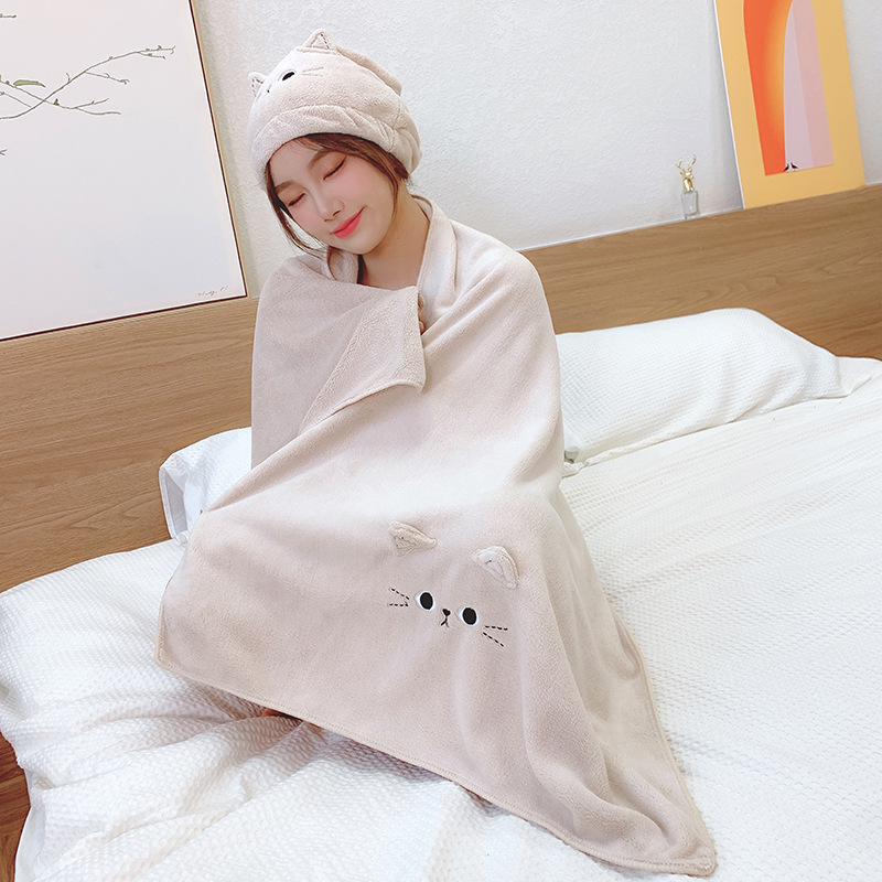 可爱卡通憨憨猫浴巾微米纱加厚洗澡巾成人女珊瑚绒吸水巾