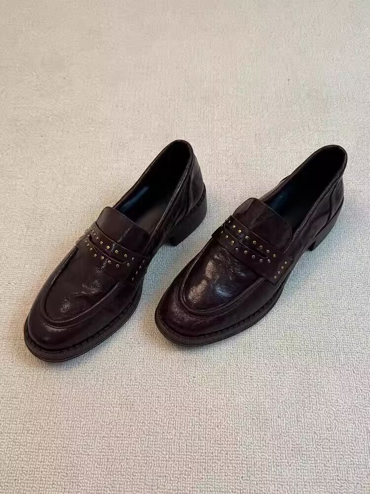牛皮版~乐福鞋女真皮复古英伦风圆头铆钉褶皱一脚蹬粗跟小皮鞋女