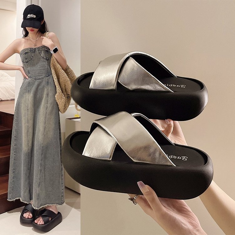 交叉带厚底松糕拖鞋女外穿2025春夏新款韩版法式复古踩屎感凉拖鞋