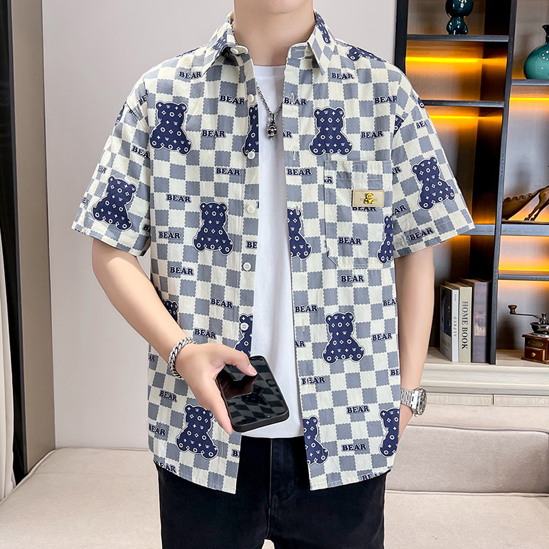 夏季条纹短袖衬衫潮牌五分修男士休闲衬衣韩版潮流帅气恤男