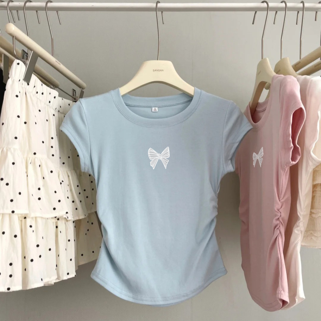 小个子多巴胺印花奶蓝色T恤夏季抽褶掐腰显瘦正肩短袖上衣女