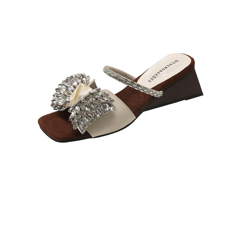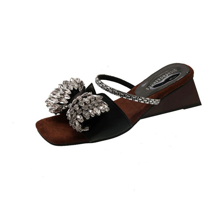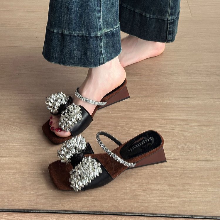 拖鞋女夏外穿2025新款绝美仙女风法式水钻蝴蝶结粗跟韩系一字拖