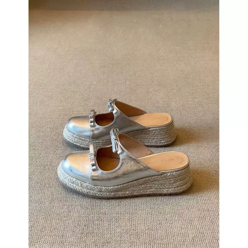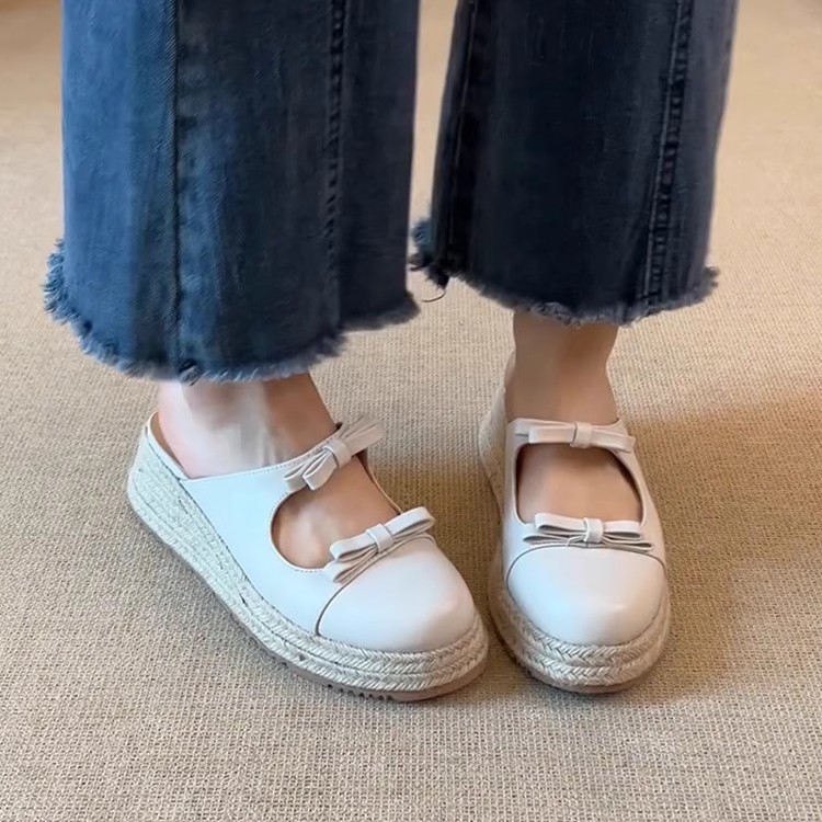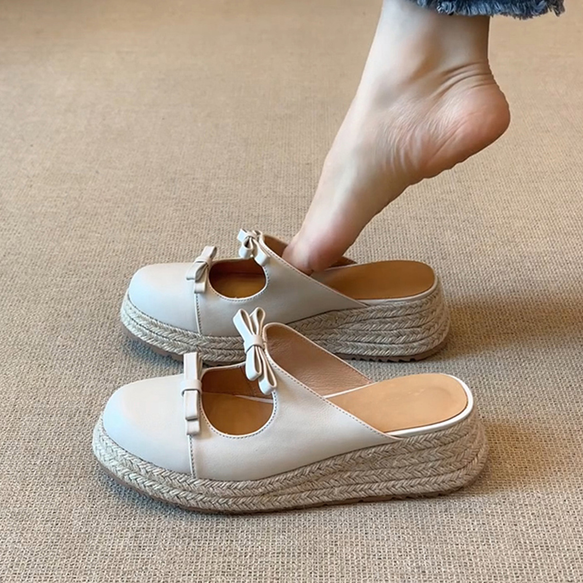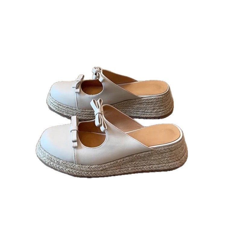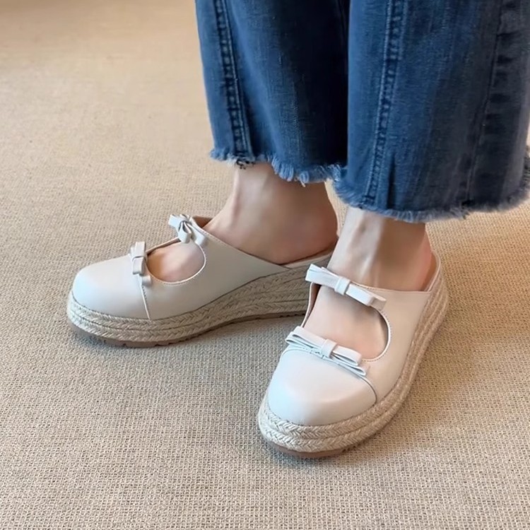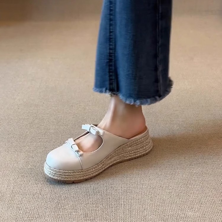 羊皮版~厚底草编包头蝴蝶结凉拖女圆头浅口一字带松糕低半拖凉鞋