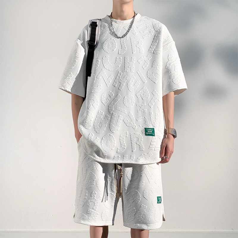 优质新款美式肌理感运动套装男士五分袖T恤短裤潮牌宽松两件套装