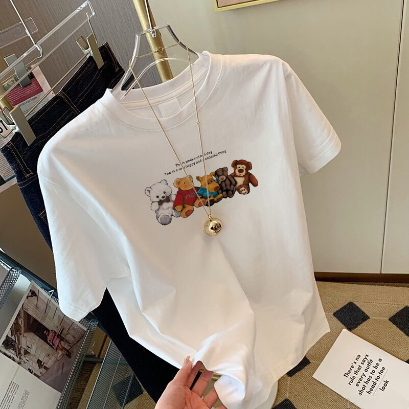 2025夏季新款纯棉白色卡通小熊短袖t恤女宽松百搭小个子洋气上衣