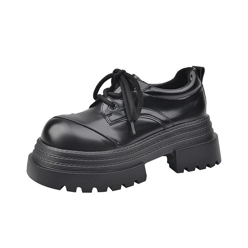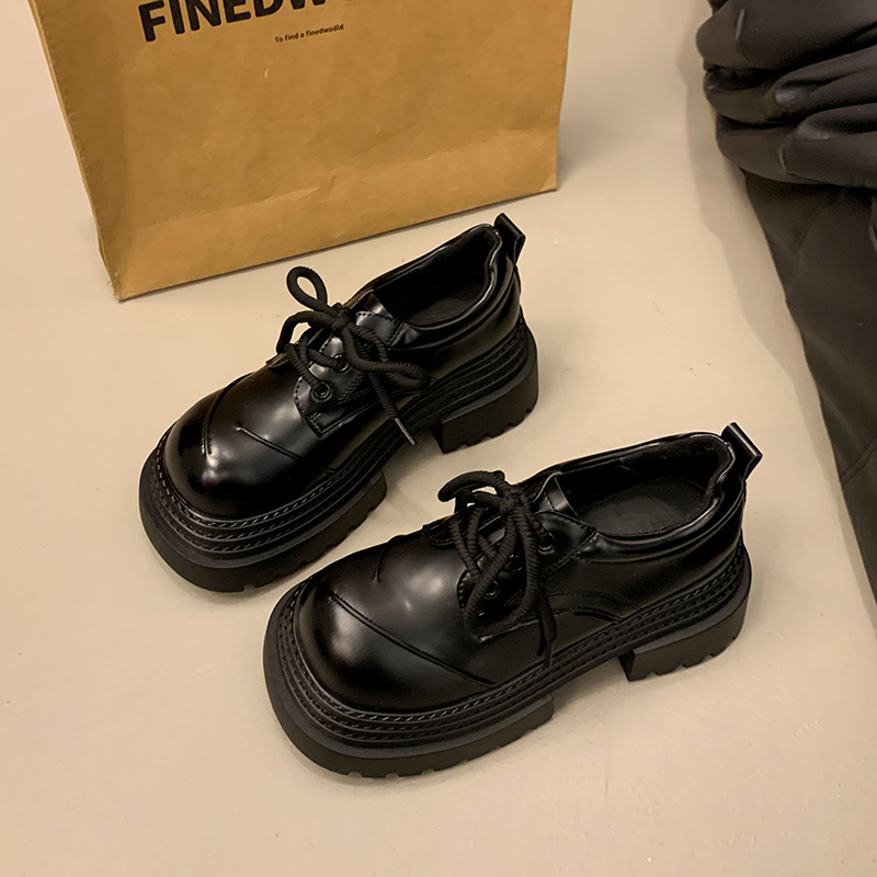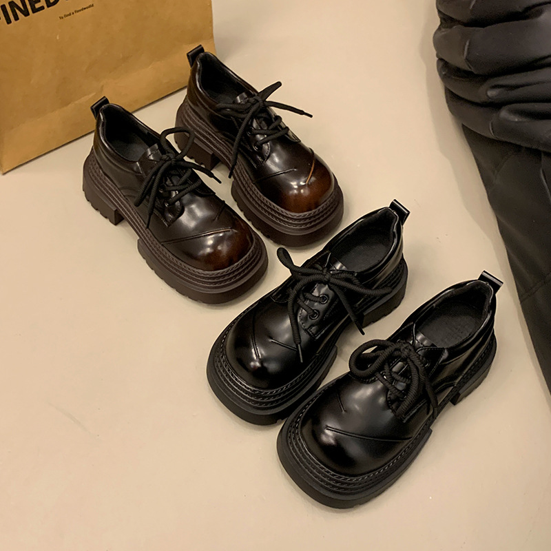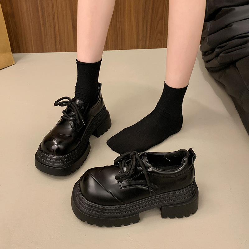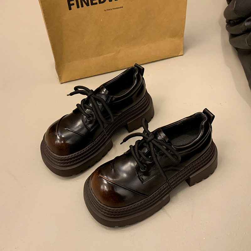 欧货真皮厚底小皮鞋女2025春季新款英伦圆头系带小个子增高乐福鞋