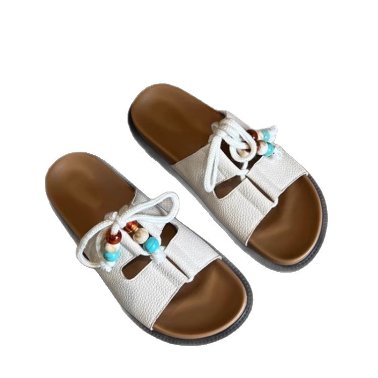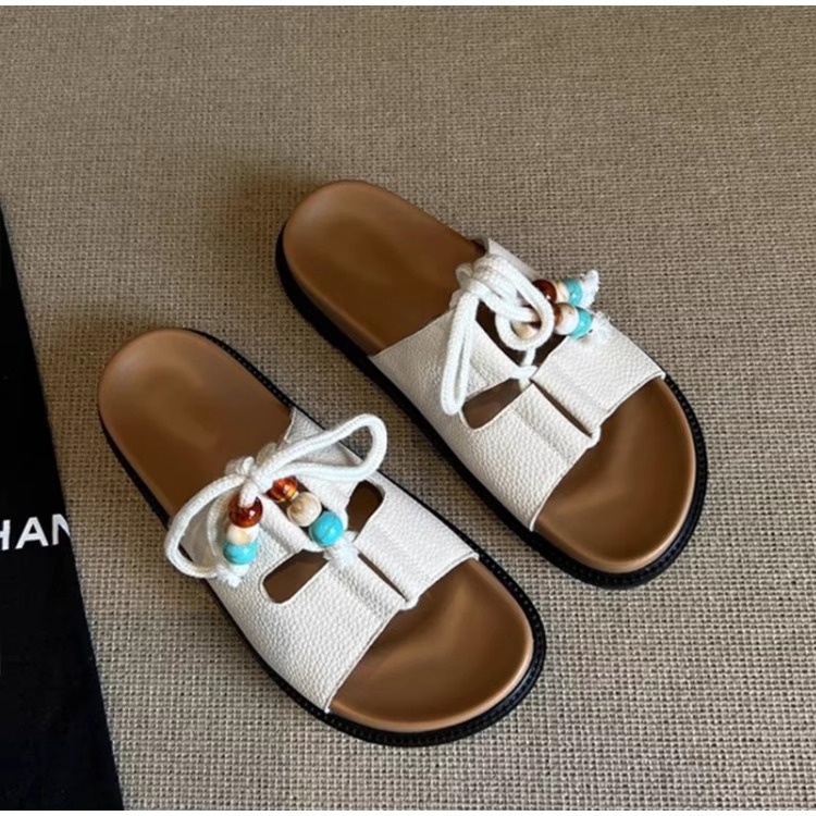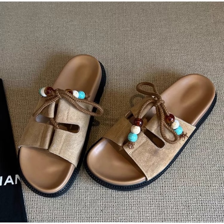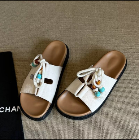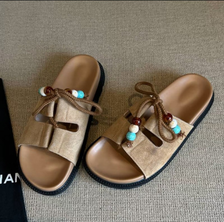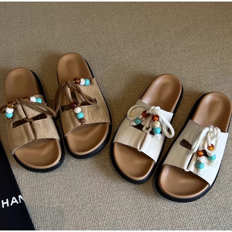 牛皮版~复古露趾松糕厚底串珠一字拖女时尚设计感懒人一脚蹬凉拖