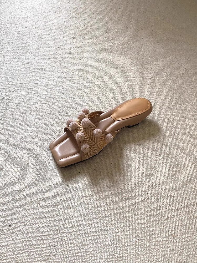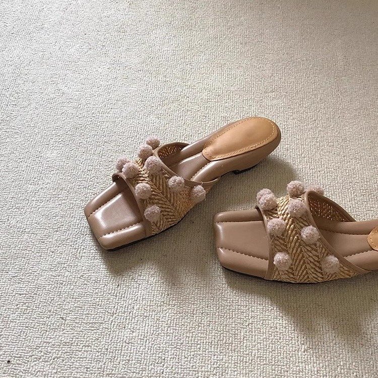 羊皮版~复古度假风踩屎感凉拖女夏季方头真皮坡跟懒人草编一字拖