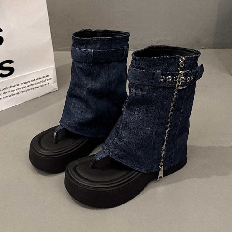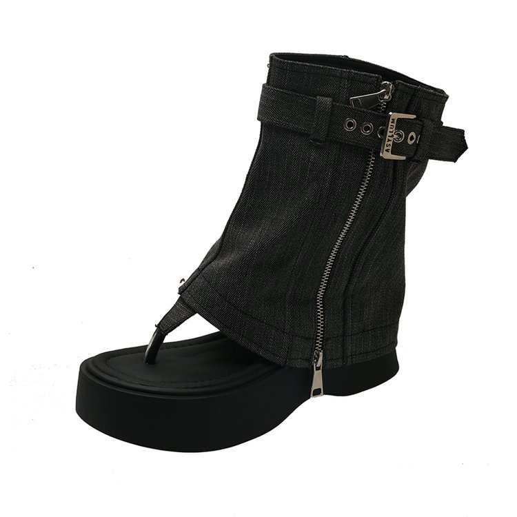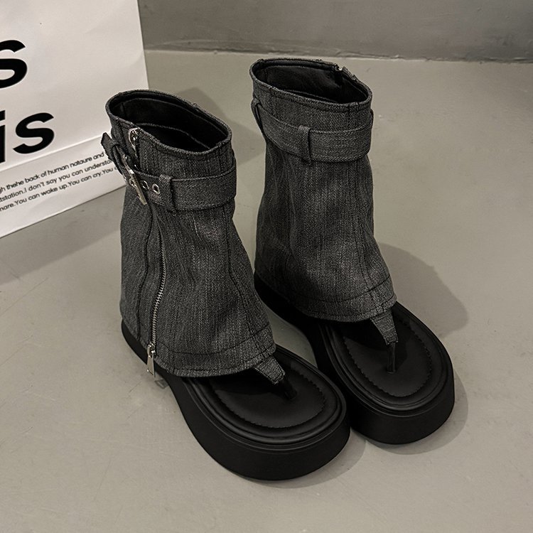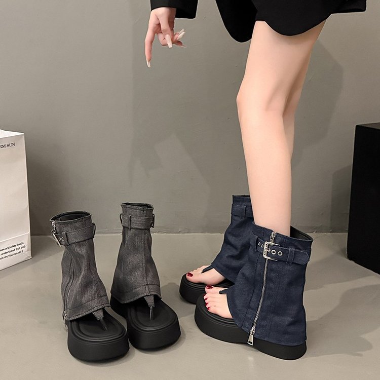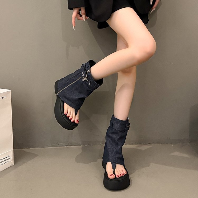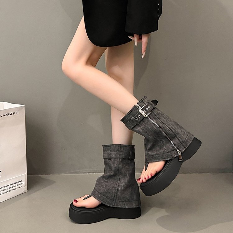 6cm厚底裤管靴女2025夏季新款小个子增高夹趾沙滩凉鞋松糕罗马鞋