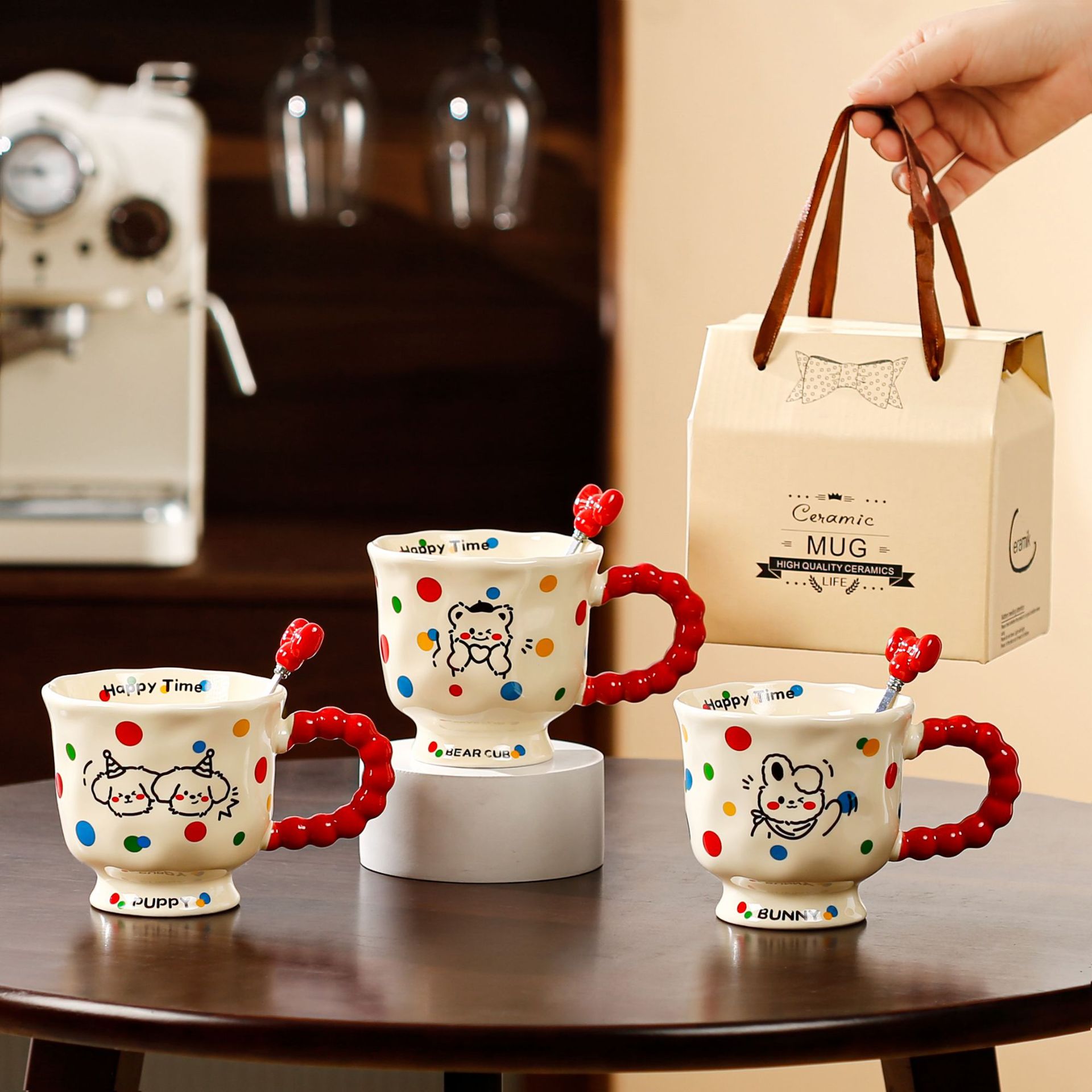 卡通萌宠陶瓷杯可爱波点马克杯高颜值情侣水杯跨境伴手礼杯子